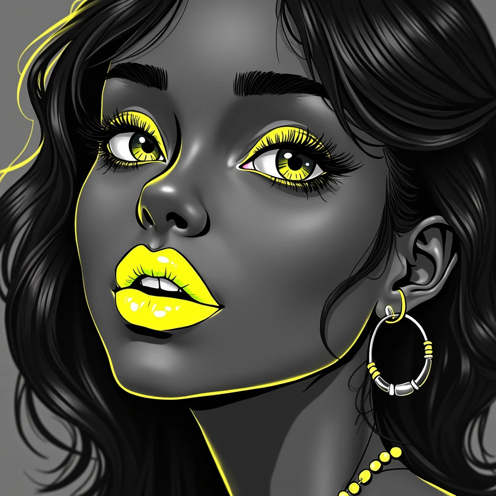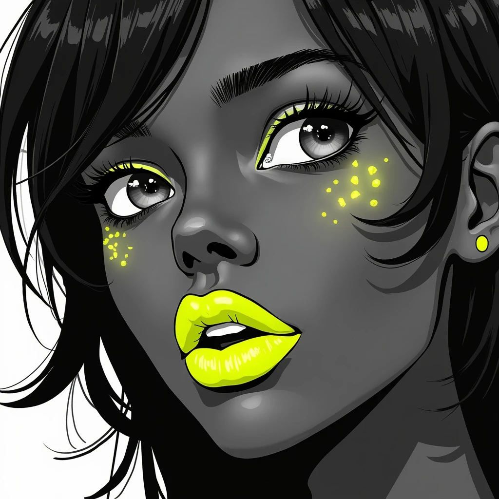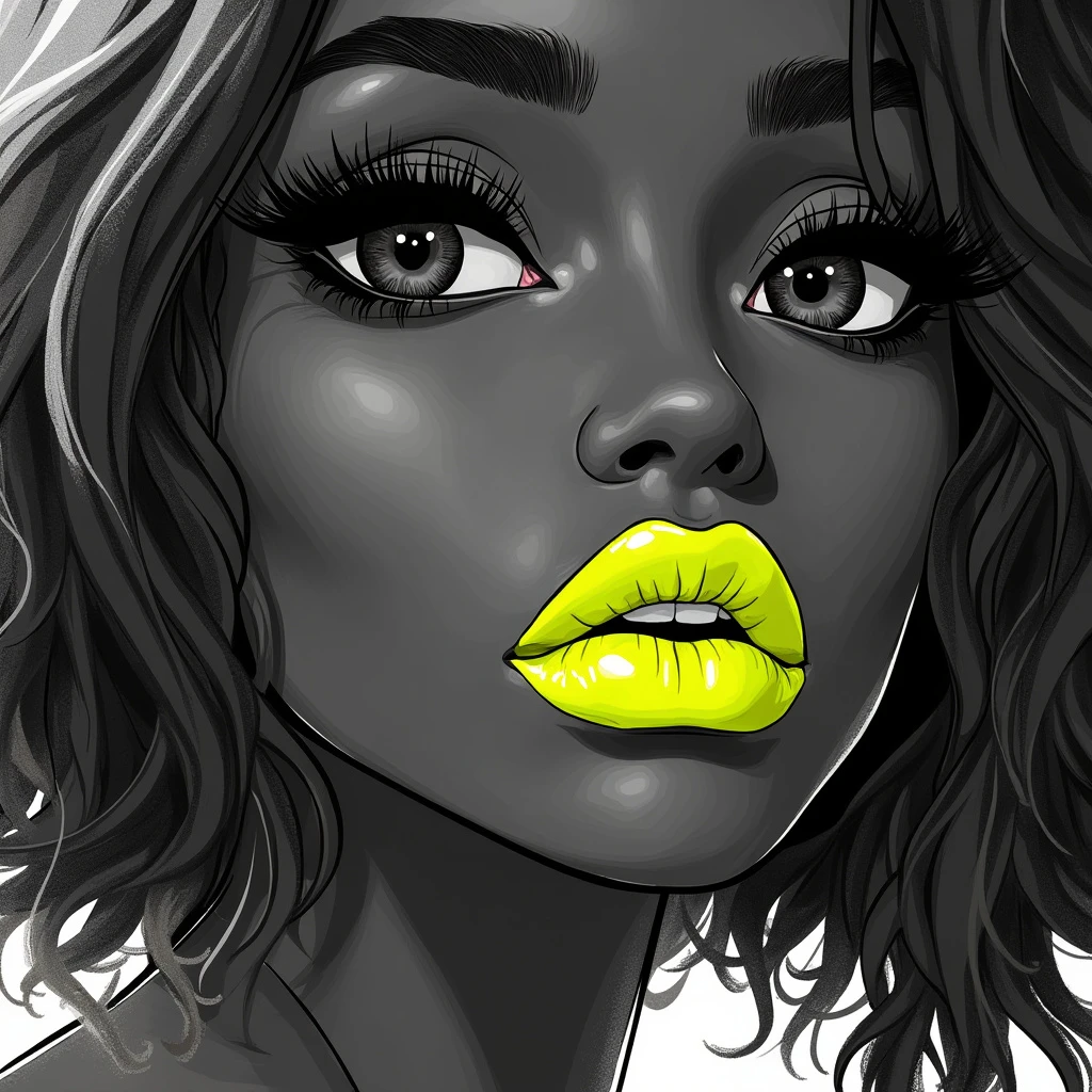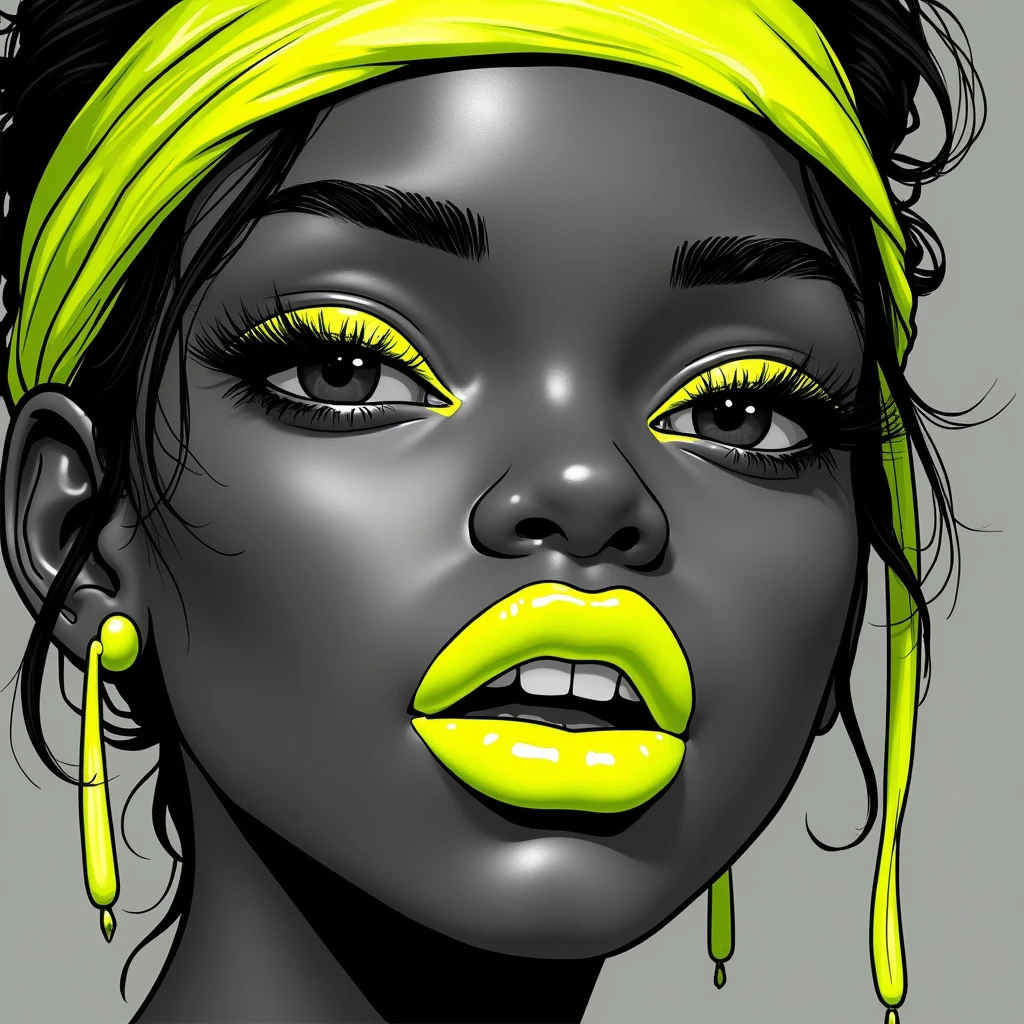 b&w, fashion portrait of a face of young, black skin, stunning woman featuring neon yellow lips as the focal point, set against a monochrome scene, blending photography with a pop of vibrant color