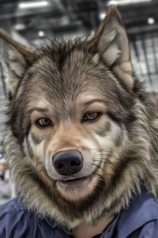 realistic photo (sharp focus, highly detailed, 4k, 8k, best quality, masterpiece, ultra highres:1), BerettaDarkwolf, half transformation, smirk, wolf, look at viewer, human