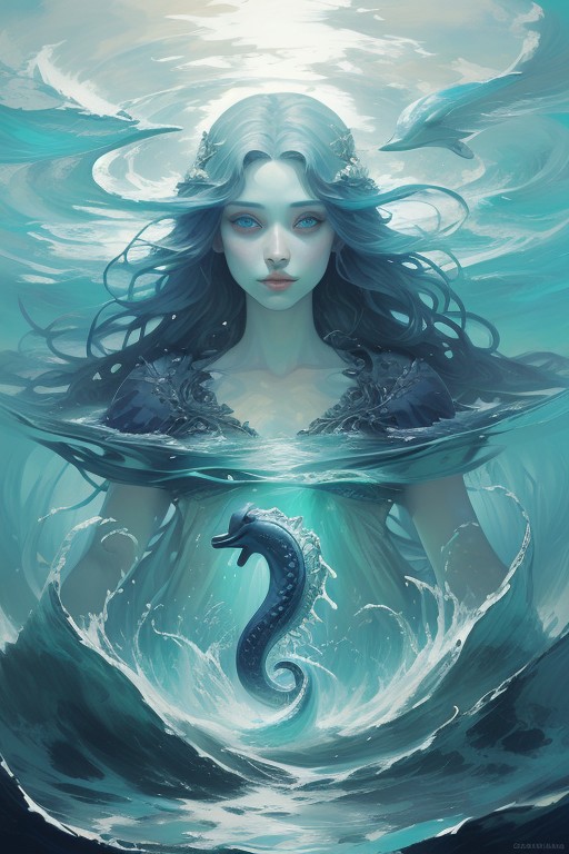 craiyon_033701, Nimlaser, Goddess of the Sea, high detail, high_resolution, dungeons_and_dragons, BadDream, oil painting, Appearance: divine figure, ethereal beauty, flowing long hair, shimmering like waves, ocean-blue eyes, radiant skin with a hint of pearlescent glow, graceful and fluid movements, majestic presence. Attire: flowing sea-green and azure robes, adorned with seashells and pearls, translucent fabrics, intricate sea-themed patterns, scales incorporated into clothing, elegant and fluid design. Pose and Expression: standing gracefully on water or sea foam, arms extended as if controlling the tides, serene and commanding expression, calm and confident demeanor, looking out over the ocean, gentle smile. Setting: deep ocean depths, coral reefs, underwater palace, twilight at sea, crashing waves, serene lagoon, tropical beach, glowing marine flora, underwater ruins. Symbols and Accessories: trident, flowing seaweed staff, pearls and seashells, marine creatures (dolphins, fish, seahorses), ethereal light beams from above or below water, flowing tides, mystical symbols of the sea. Color Palette: ocean blues, turquoise, seafoam greens, deep navy, shimmering silvers, pearlescent accents, vibrant coral colors. Atmosphere: mystical, serene, powerful, enchanting, fluid, calm, otherworldly, refreshing. Art Style: highly detailed, fantasy realism, fluid and dynamic, trending on ArtStation, inspired by the sea, vibrant and luminous.