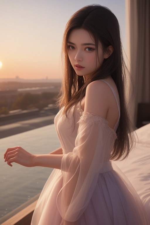 a mesmerizing female model , with (striking:1.3) features, (graceful:1.2) posture, and (confident:1.2) gaze, posing in a (flowing:1.1) gown against a (dramatic:1.2) sunset backdrop, (golden hour:1.1) lighting casting a warm glow, (gentle:1.1) breeze gently tousling her hair, (delicate:1.2) flowers in her hands, (ethereal:1.3) atmosphere, (timeless:1.2) beauty captured by (renowned:1.2) fashion photographer, (insert photographers name), using a (high resolution:1.1) medium format camera, (prime lens:1.2) for exquisite detail and (dreamy:1.1) bokeh, {dark brown hair, long hair, blown hair, [[large breasts]], medium breasts, purple eyes}, wet, {sweat} , bedroom