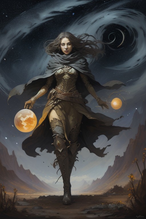 craiyon_120434, Zopha, God of Plants, high detail, high_resolution, dungeons_and_dragons, BadDream, oil painting, elegant and athletic figure, confident expression, bright eyes, flowing hair that resembles a starry night, dynamic and graceful posture, youthful and adventurous look. flowing robes that resemble a map or constellations, travel-themed accessories, cloak with swirling patterns of wind, compass amulet, winged sandals or boots, layered clothing suggesting different climates and terrains. mid-stride, arms outstretched, looking into the distance, inviting gesture, joyful and curious expression, poised as if ready to embark on a journey. open road, vast landscape, crossroads, celestial sky filled with stars and constellations, diverse terrains like mountains, deserts, forests, and seas, sunset or sunrise background. staff with a compass or globe, celestial map in hand, guiding light or lantern, animals like birds or butterflies in motion, wind motifs, trails of stardust or light, navigational tools. vibrant blues and greens, warm earth tones, starry night colors, bright and energetic hues, celestial golds and silvers. adventurous, open and welcoming, expansive and free, inspiring wanderlust, sense of movement detailed and dynamic, fantasy realism, fluid brushwork, capturing movement and energy, trending on ArtStation, storytelling through visuals.