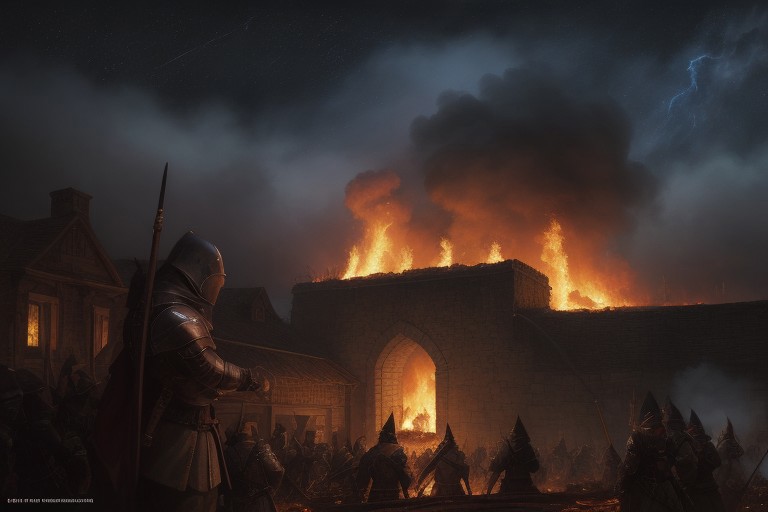 ((oil painting)), old castle Burning, dungeons at fire, thunder and heavy rain, large smoke and fire, ruined village in front, army of knight in front, night sky, dnd, fantasy art, ((clyde caldwell)), larry elmore, frank frazetta, <lora:CityLora:0.8>