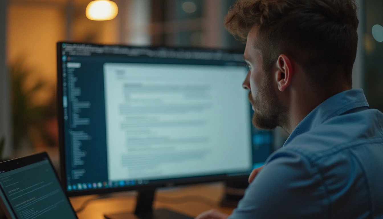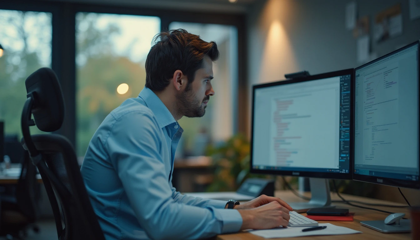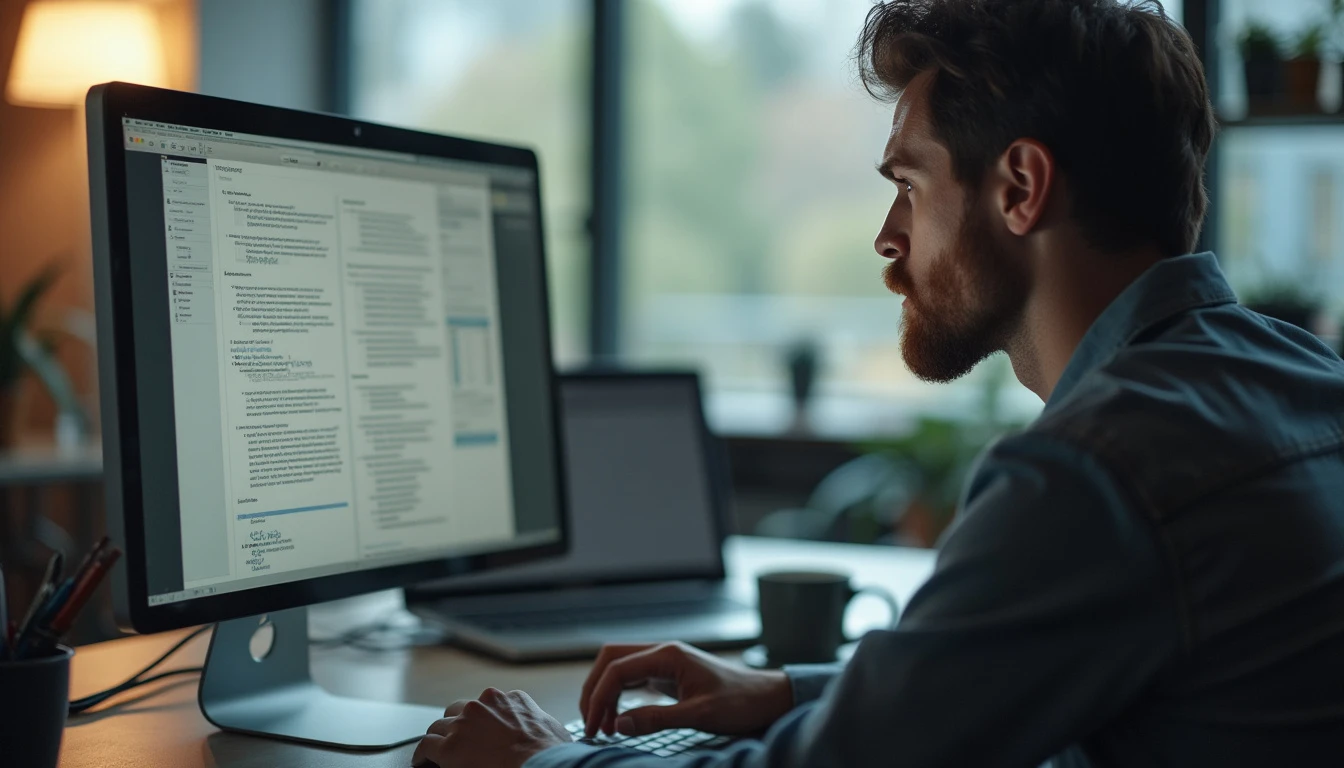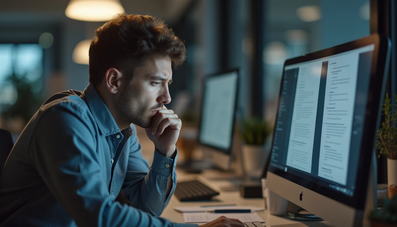 A close-up shot of a person sitting at a desk, staring at a computer screen displaying a half-written report, in a modern office, with a look of frustration and indecision, during a late afternoon, shot with a Fujifilm GFX 100S, 50mm f/1.4 lens, desaturated colors with a focus on the face