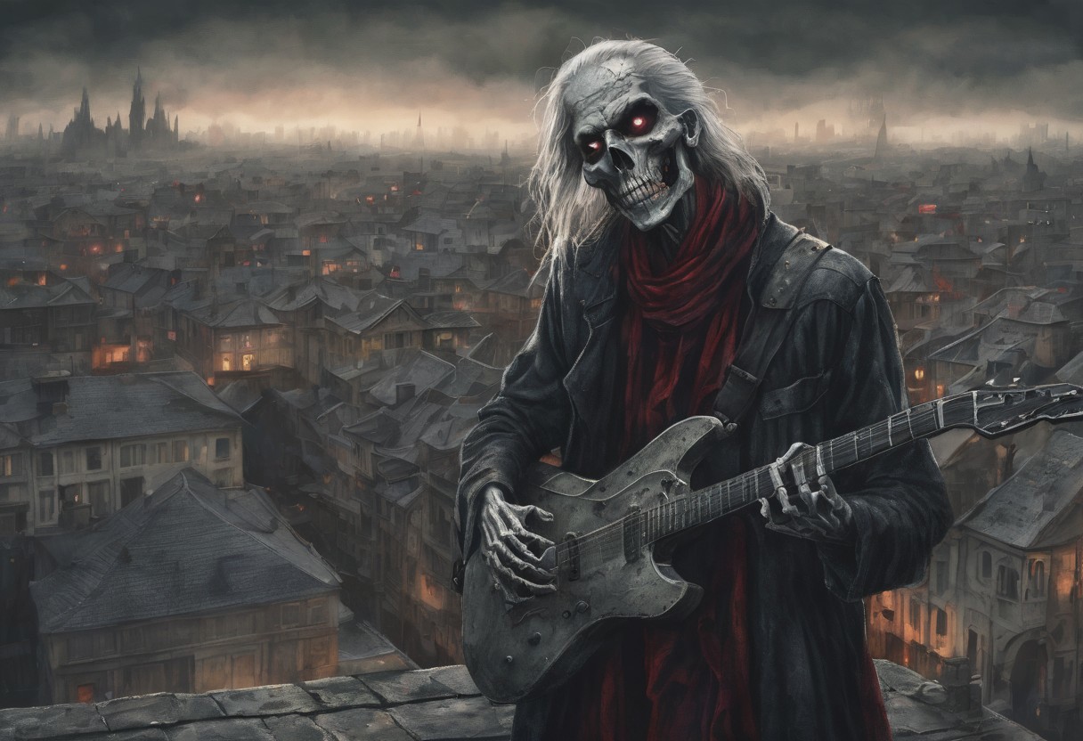 dead man skeleton anarchist with electric guitar in heavy metal style, low light, gray hair fluttering in the wind, against the background of the roofs of a night medieval city, deathly green light around, red eyes in the dark, dark fantasy style, ultra-realistic