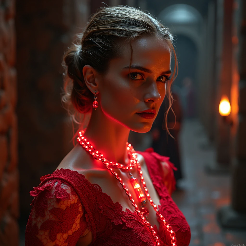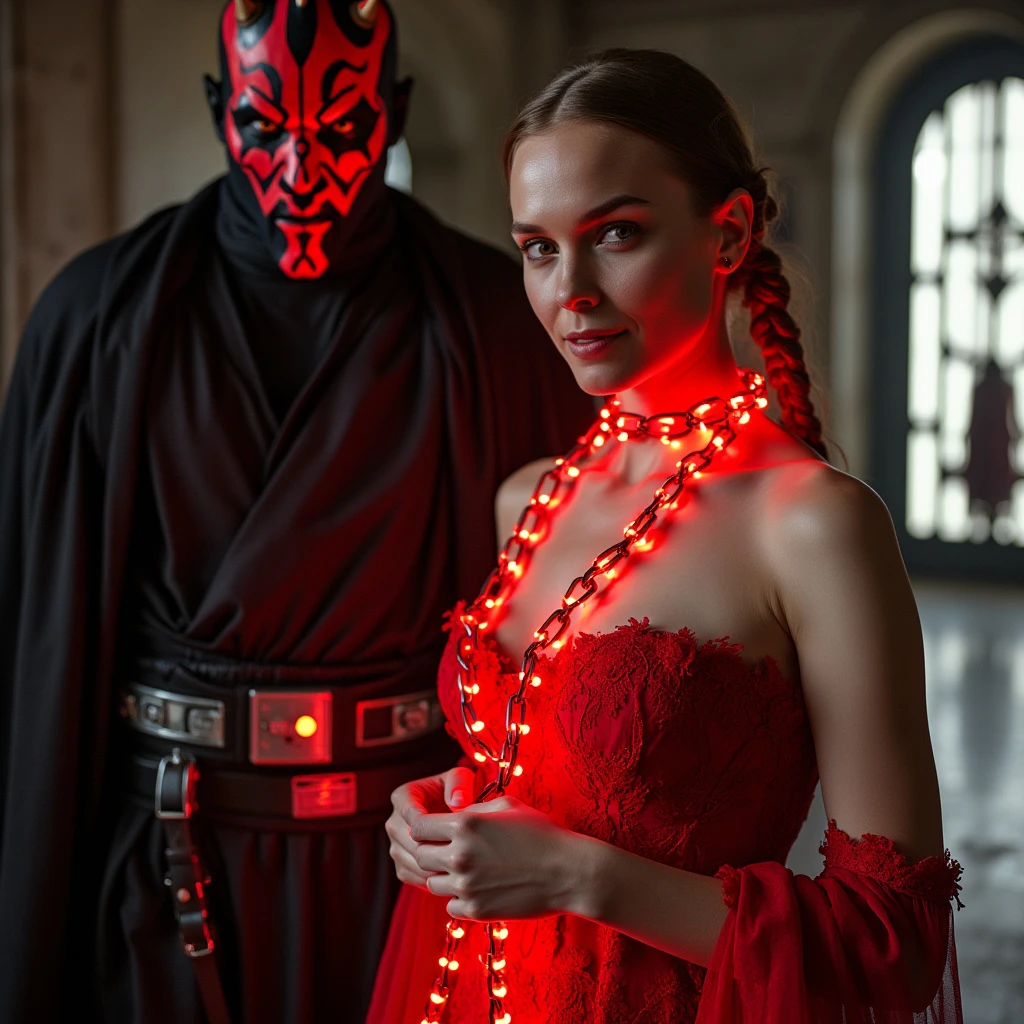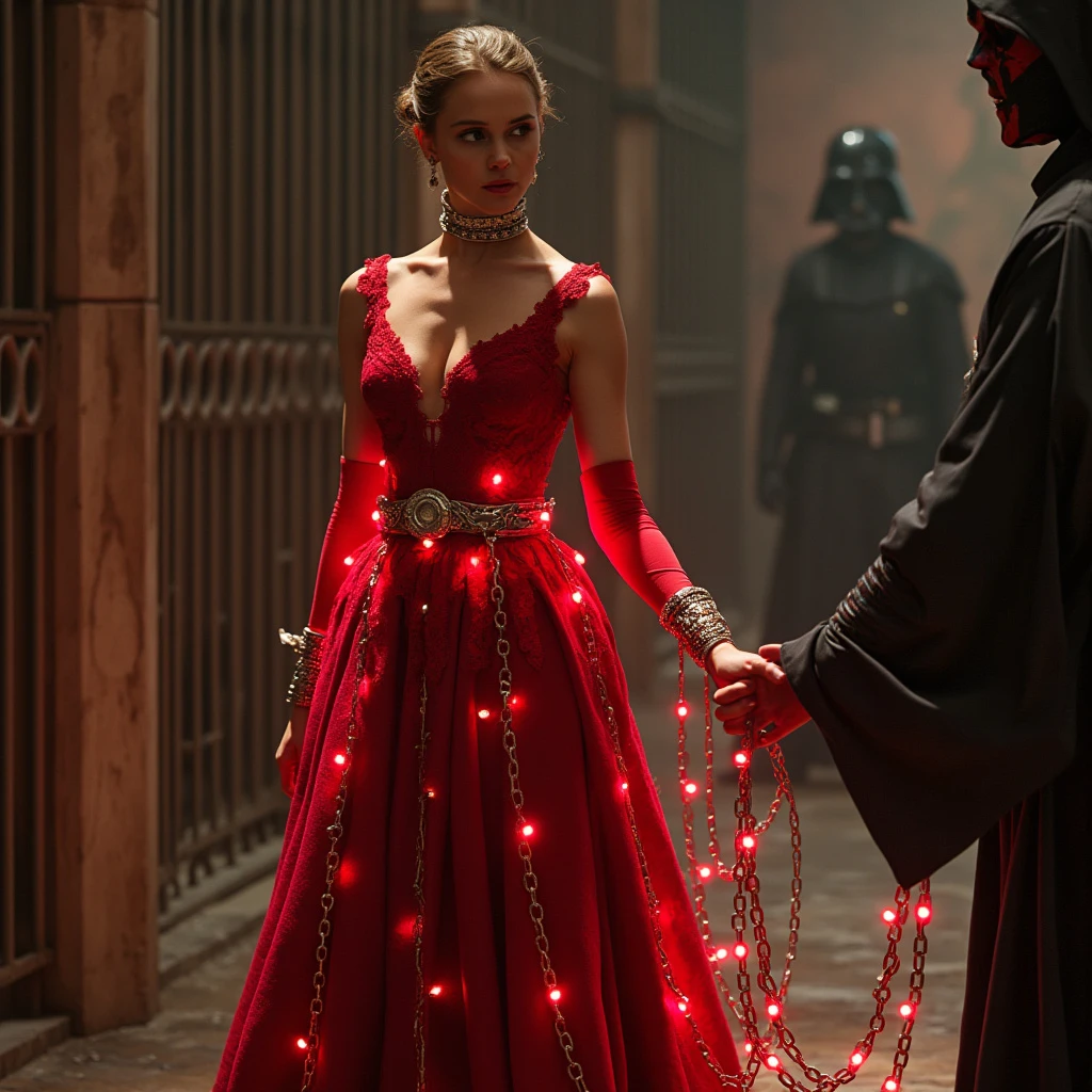 natalie portman as padme from star wars, she is wearing a red lace prom dress, she is with Darth Maul in a star wars prison, collard around her neck with glowing red chain leading to darth maul's hand, she is wrapped in glowing red chains, highly detailed, photo realistic, still shot, photo realism, head to toe full body photo, 8k high resolution, high detail