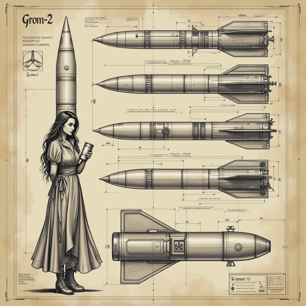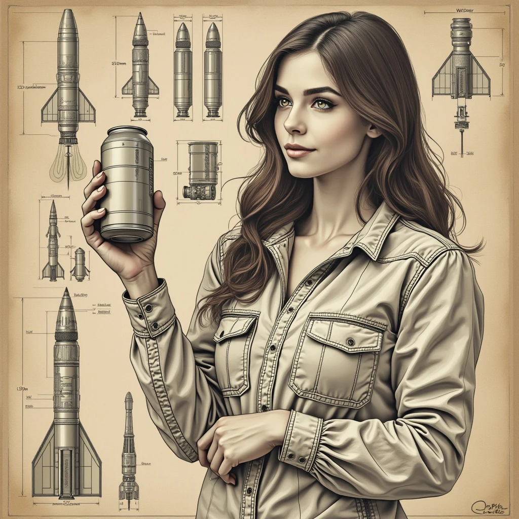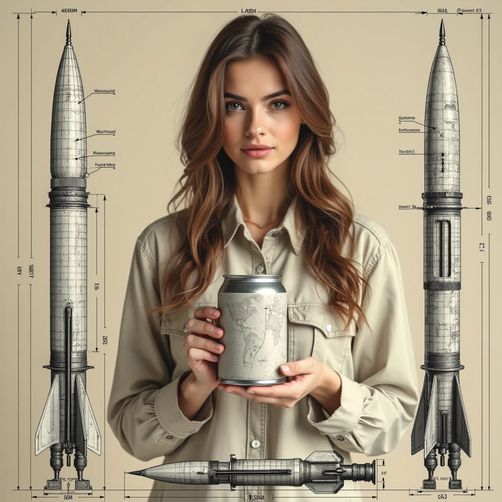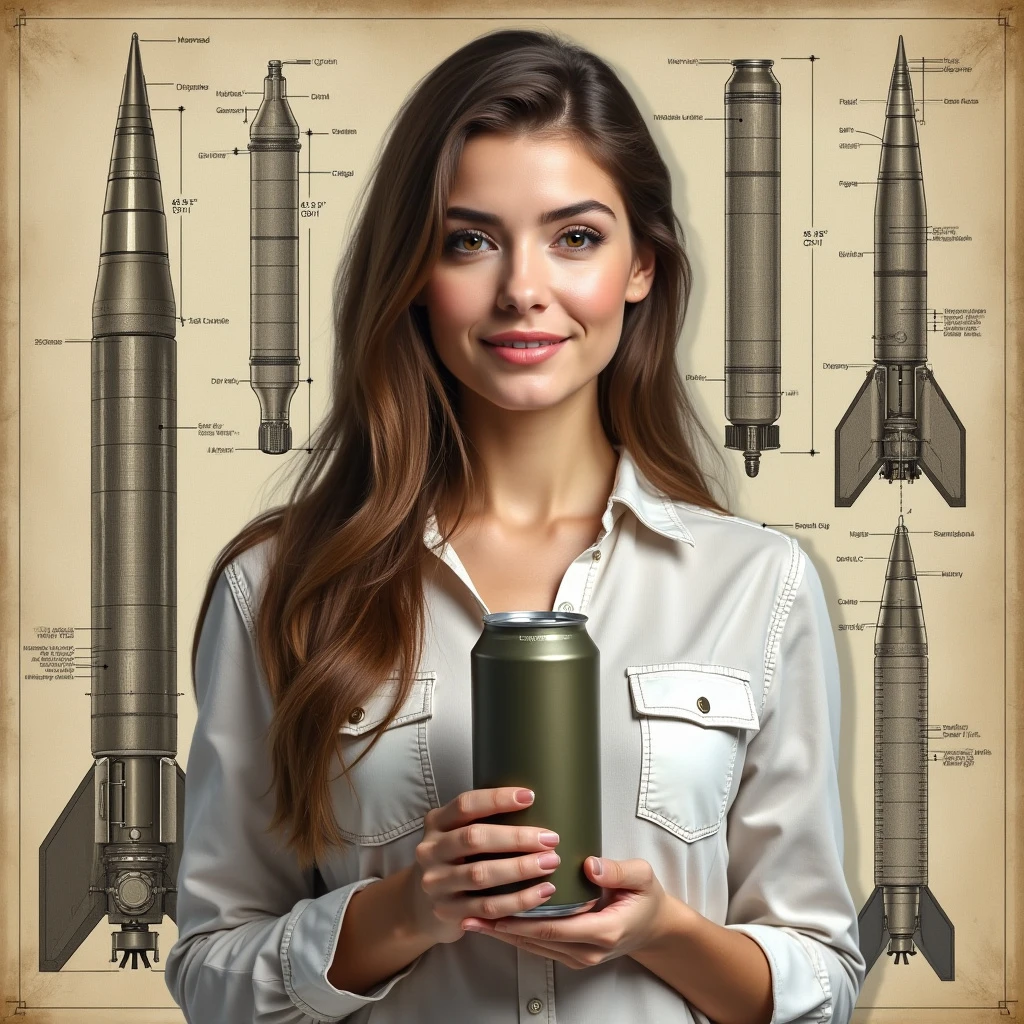 Brunette, background - professional photo studio with beige background, in her left hand she is holding a wide cylindrical tin can, showing a product, 50 mm lens, background, flawless, exciting, hyper-realistic product image, canon 1dx camera A highly detailed, black and white technical drawing of the Ukrainian ballistic missile 'Grom-2.' The blueprint-style illustration showcases the missile in various views, including side, cross-section, and top-down perspectives. Each component of the missile, from the warhead to the propulsion system, is meticulously rendered with precise lines, intricate details, and technical annotations. The drawing includes labels for each part, such as the guidance system, fuel tanks, and stabilization fins, all depicted with engineering accuracy. The overall style is monochromatic, resembling an authentic technical blueprint, with an emphasis on clarity, scale, and the complexity of the missile's design
