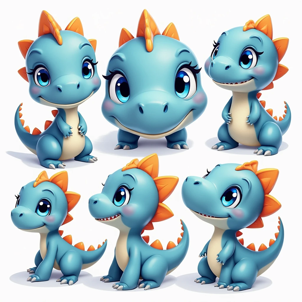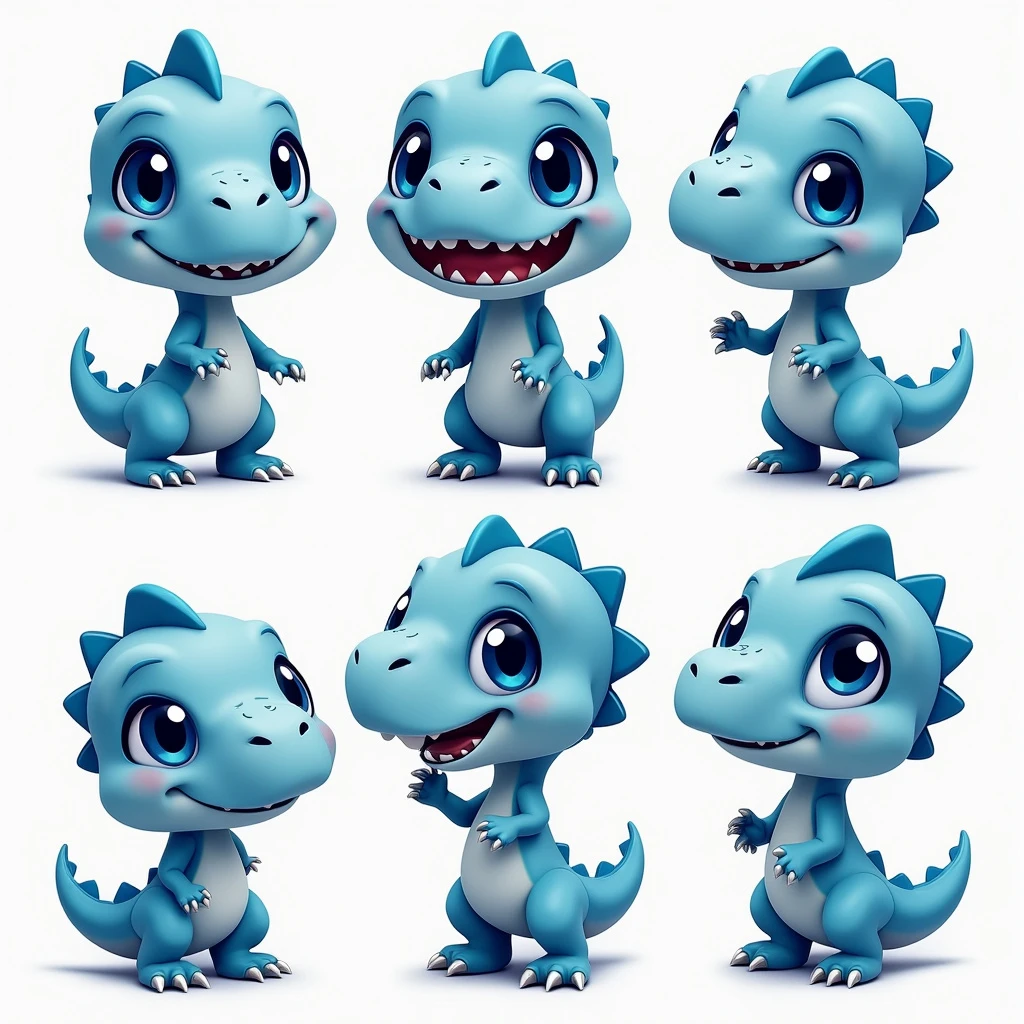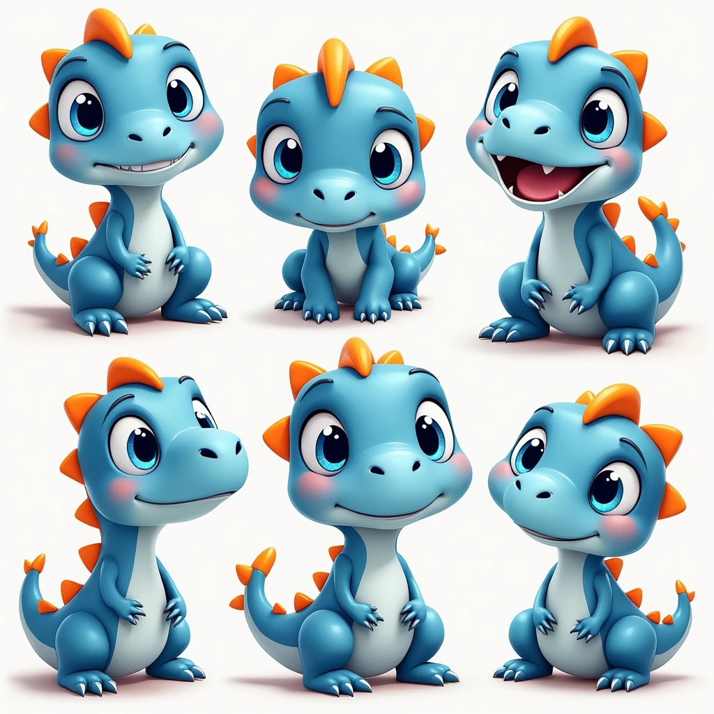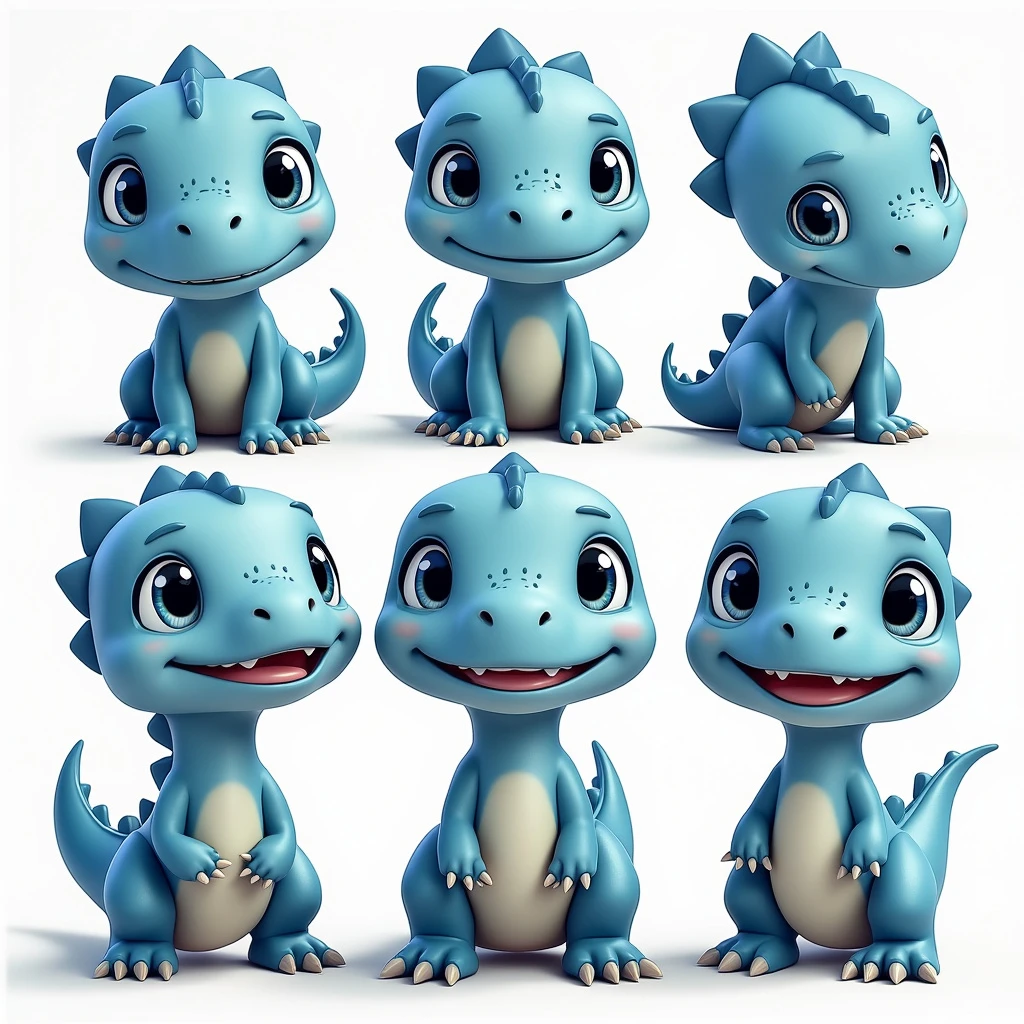 Baby blue dino character, multiple poses and expressions, front view, pixar styled character, cute, full colour, blue eyes, White background