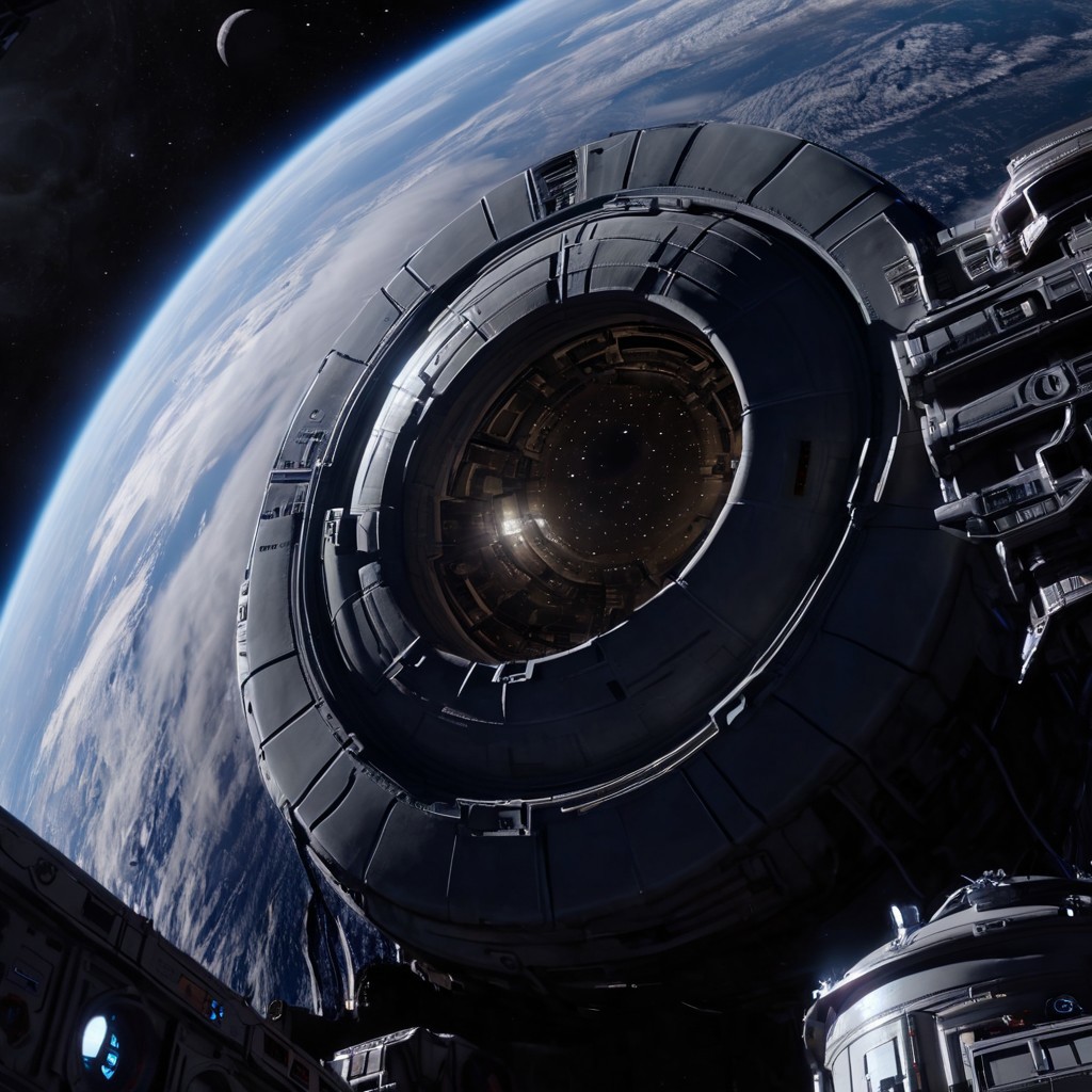 "in the cockpit your small space-cruiser, flying into the enormity of the cylindrical space habitat, the diameter of which is nearly 2 kilometres, always a bit of a surreal experience, watching the slow rotation of the humongous cylinder around you, it almost feels like you're flying into the mouth of some giant mechanical beast, and seeing all the twinkling lights from the curving walls, probably coming from various bubble apartments, shops, and the various spacecraft repair bays that make the habitat so famous, it makes you wonder just how many permanent inhabitants it holds, it has to be millions at least, making their living inside this lone bastion of technology, all that separates them from the surrounding cold reaches of hard vacuum space." ((scifi, cinematic film still, ultra-detailed hyperrealism)),