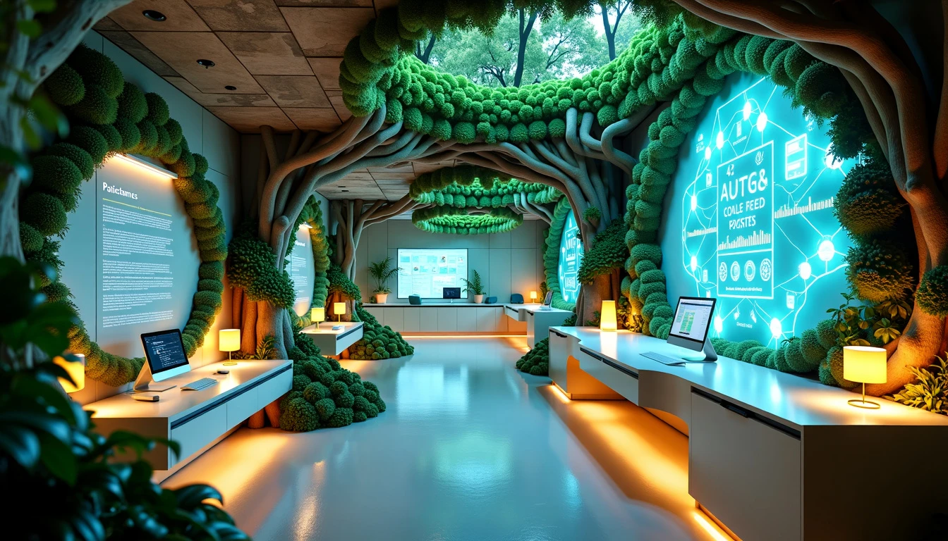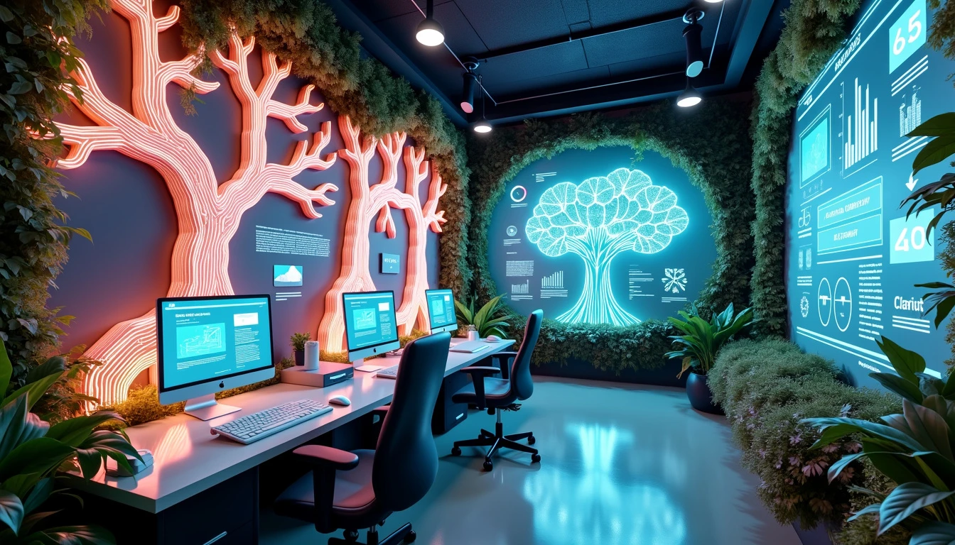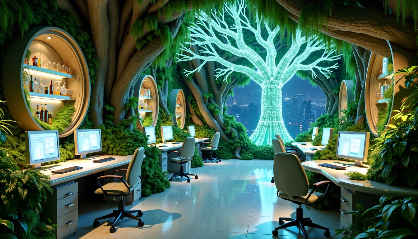 High resolution photo, 16K, Bio-Digital Hybrid: A fusion of organic and digital elements, with walls that pulse with digital veins and glowing circuitry. The large display is a digital tree, with branches made of data streams and leaves displaying research information. Lab chambers are organic pods integrated into the walls, with digital interfaces growing out of them like vines. Computers are bio-digital hybrids, with organic keyboards and displays that shift and grow based on user interaction. Soft, organic lighting mixed with sharp digital highlights creates a harmonious blend of nature and technology.