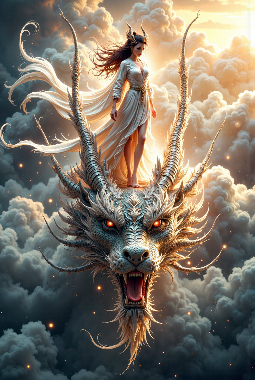 mythp0rt, glowing, A close-up of an Eastern dragon's head partially visible, emerging swiftly from thick clouds with dynamic motion blur that emphasizes the sense of speed. Standing confidently on the dragon's head between its two large horns is a beautiful fairy, who is the central focus of the image. She is dressed in flowing white robes that billow dramatically in the wind, adding a sense of grace and ethereal movement. Her expression is one of unwavering determination, her eyes fixed forward with a strong, resolute gaze. The dragon’s head is only partially shown to emphasize the fairy as the main subject, with its intricate scales and glowing eyes partially visible, adding a sense of power and mysticism. The background features swirling clouds illuminated by a soft, golden light from the setting sun, enhancing the dreamlike, mythical atmosphere of the scene. The entire image is captured in a hyper-realistic style with ultra-fine details, showcasing every texture of the fairy's flowing robes and the dragon's scales. The use of high contrast and vibrant colors adds to the dramatic effect, creating a high-quality, fantastical depiction that combines realism with a sense of magic and mythology. The scene conveys a powerful and enchanting moment, filled with motion and mythical beauty.
