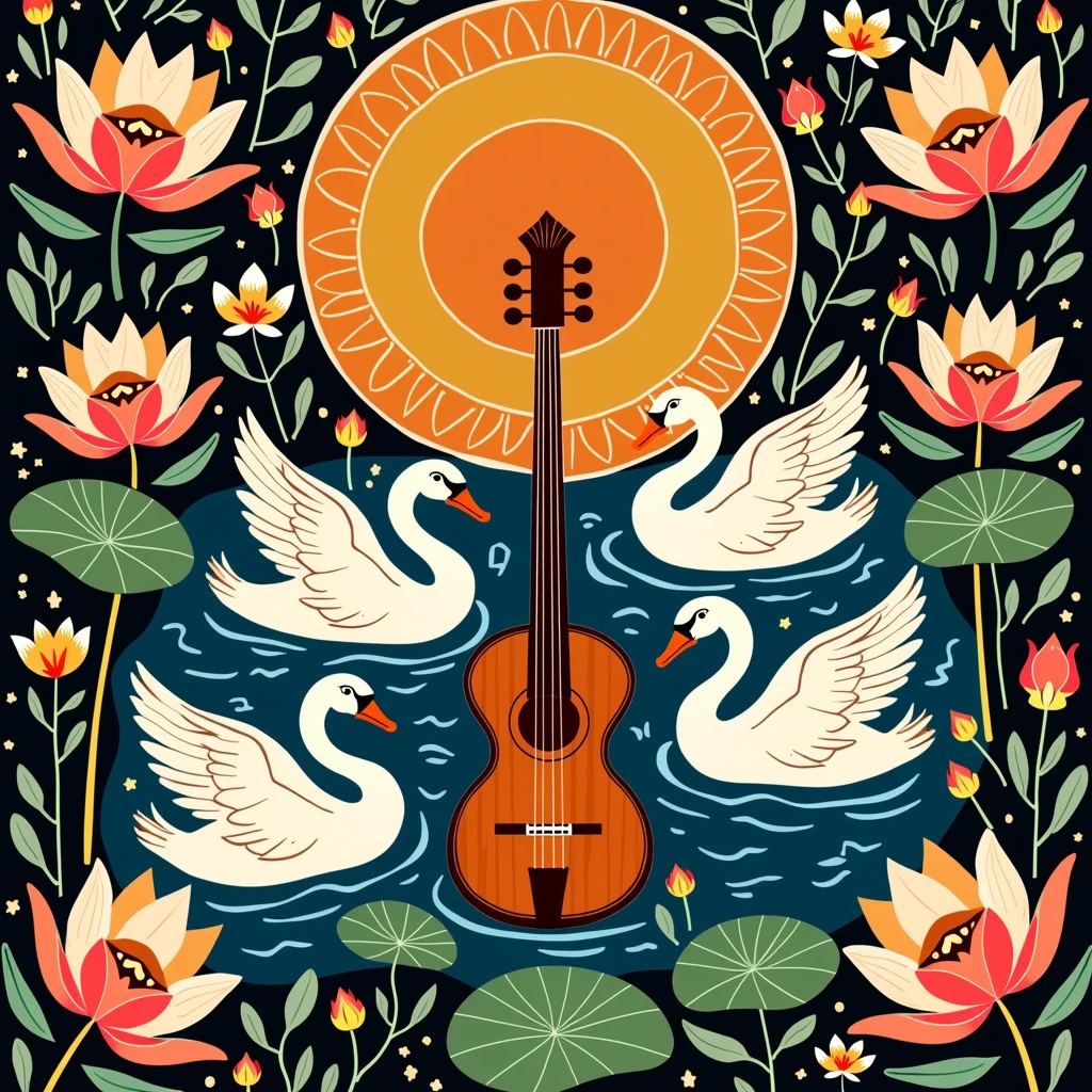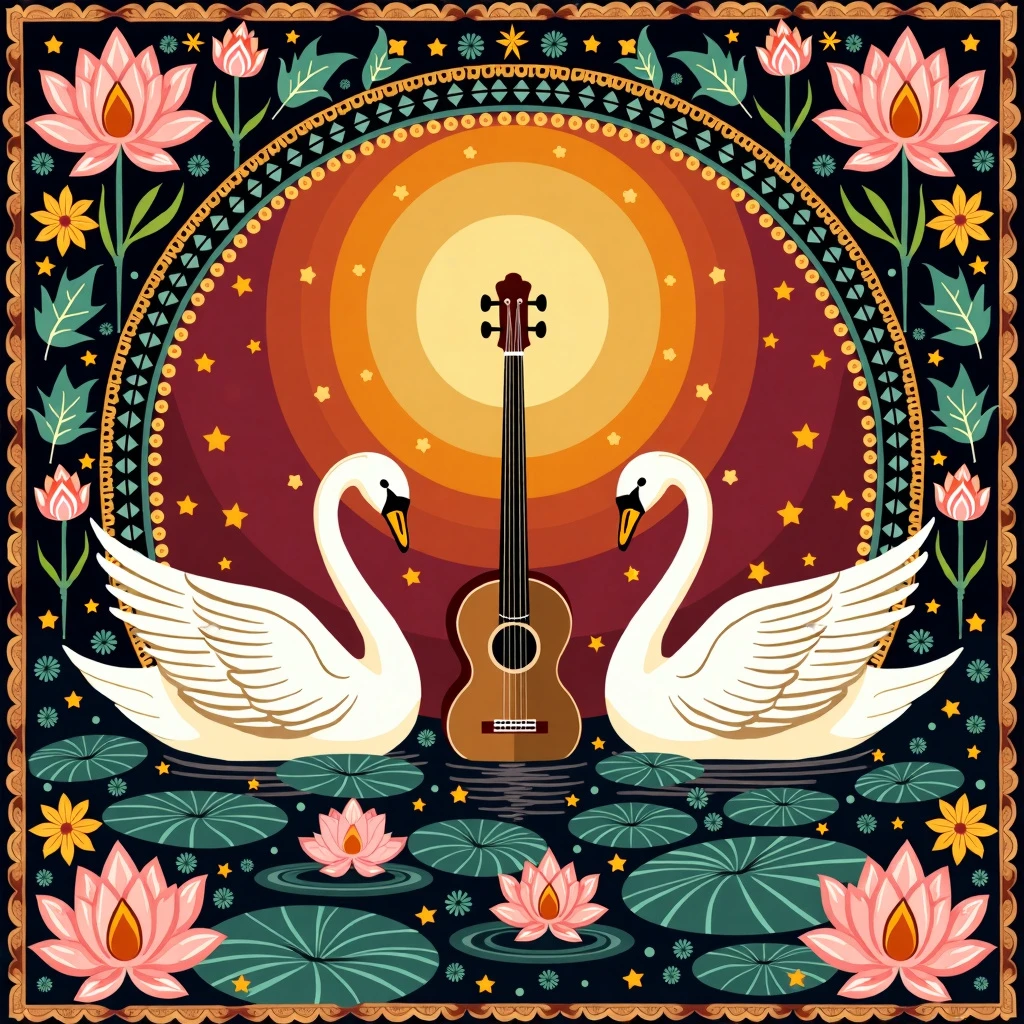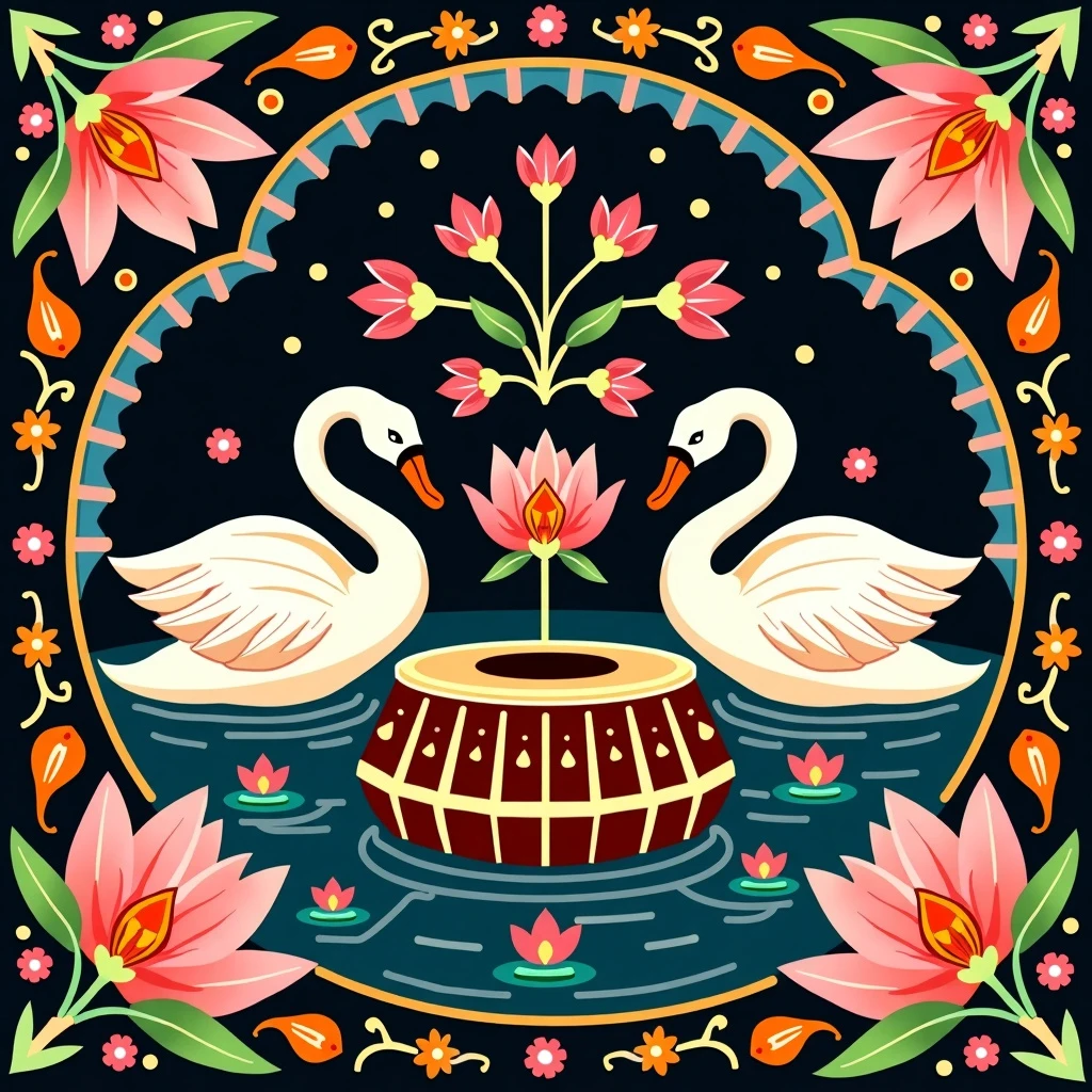 Powerpoint template design in Indian Madhubani art style with Indian music instruments, Lotus, swans