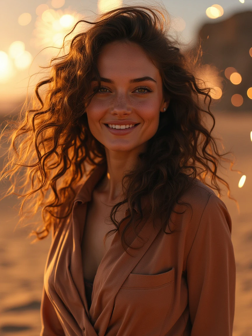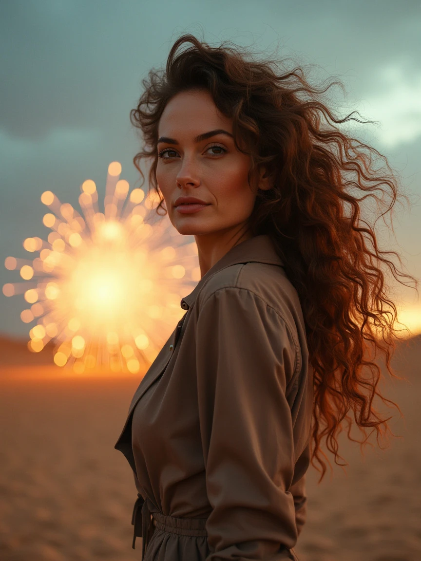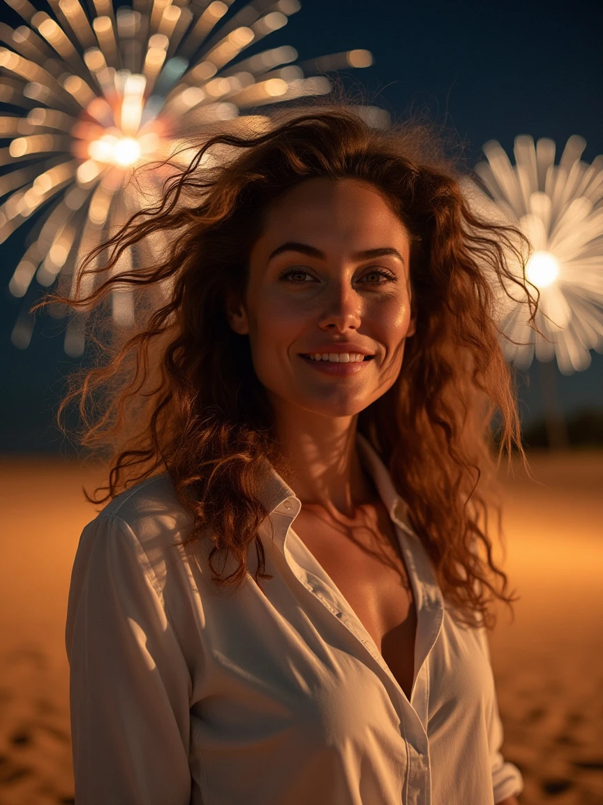 a woman in her 30’s looking really wild and happy with really flyffy hair, some curls, brown hair, face resembles Angelina Jolie, strong chin, business casual, looking at the camera, standing further away, Sahara sand in the background, fireworks in the background, natural light