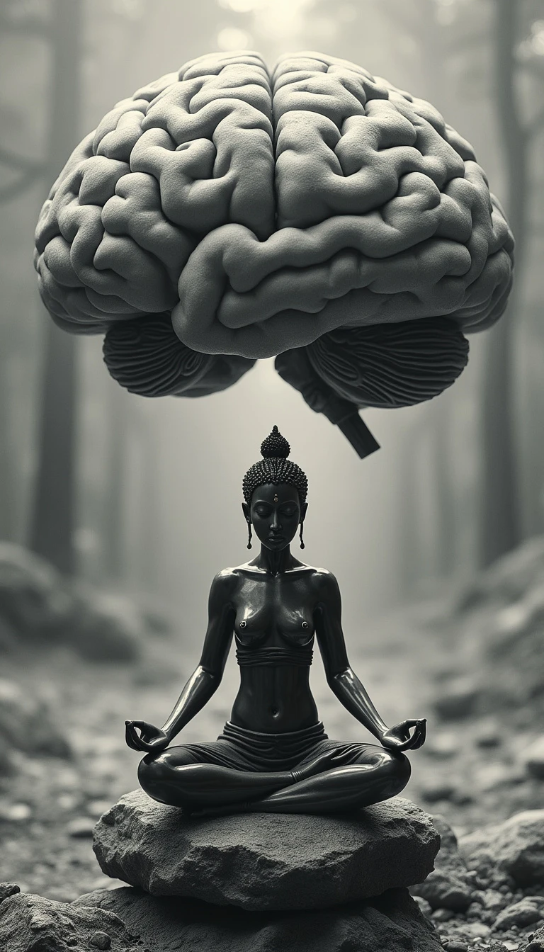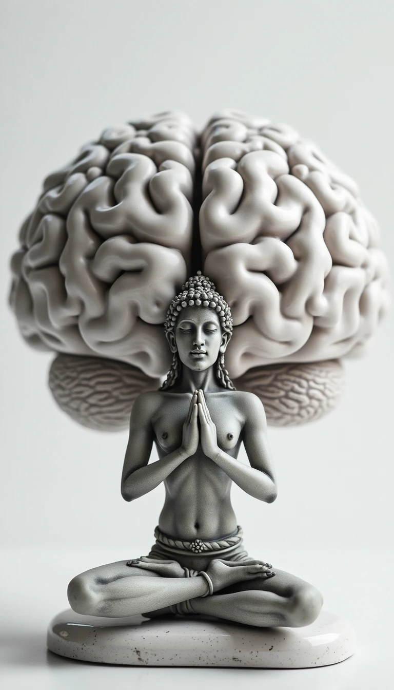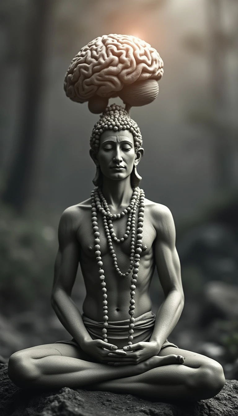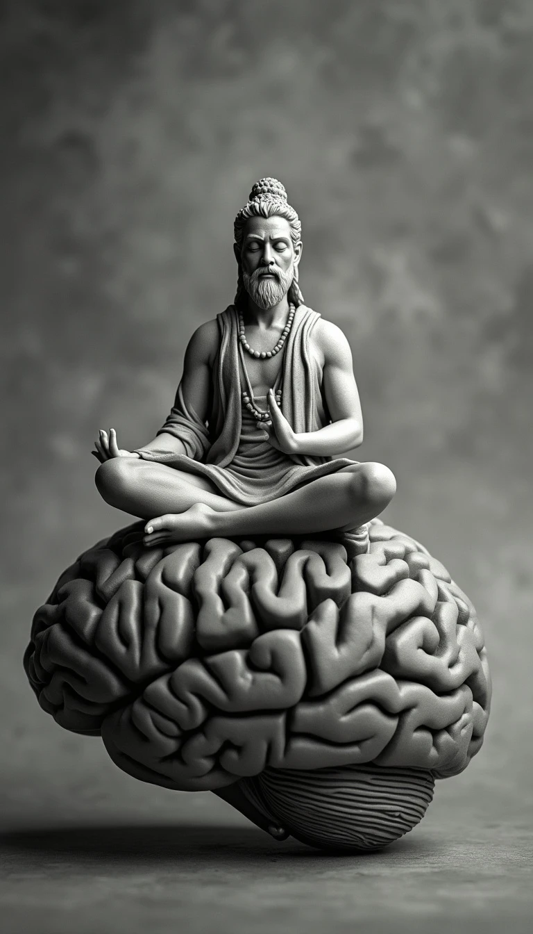 balanced brain, image that captures the essence of mental yoga using a monochromatic color scheme. In the center, place a poised and ancient yogi
