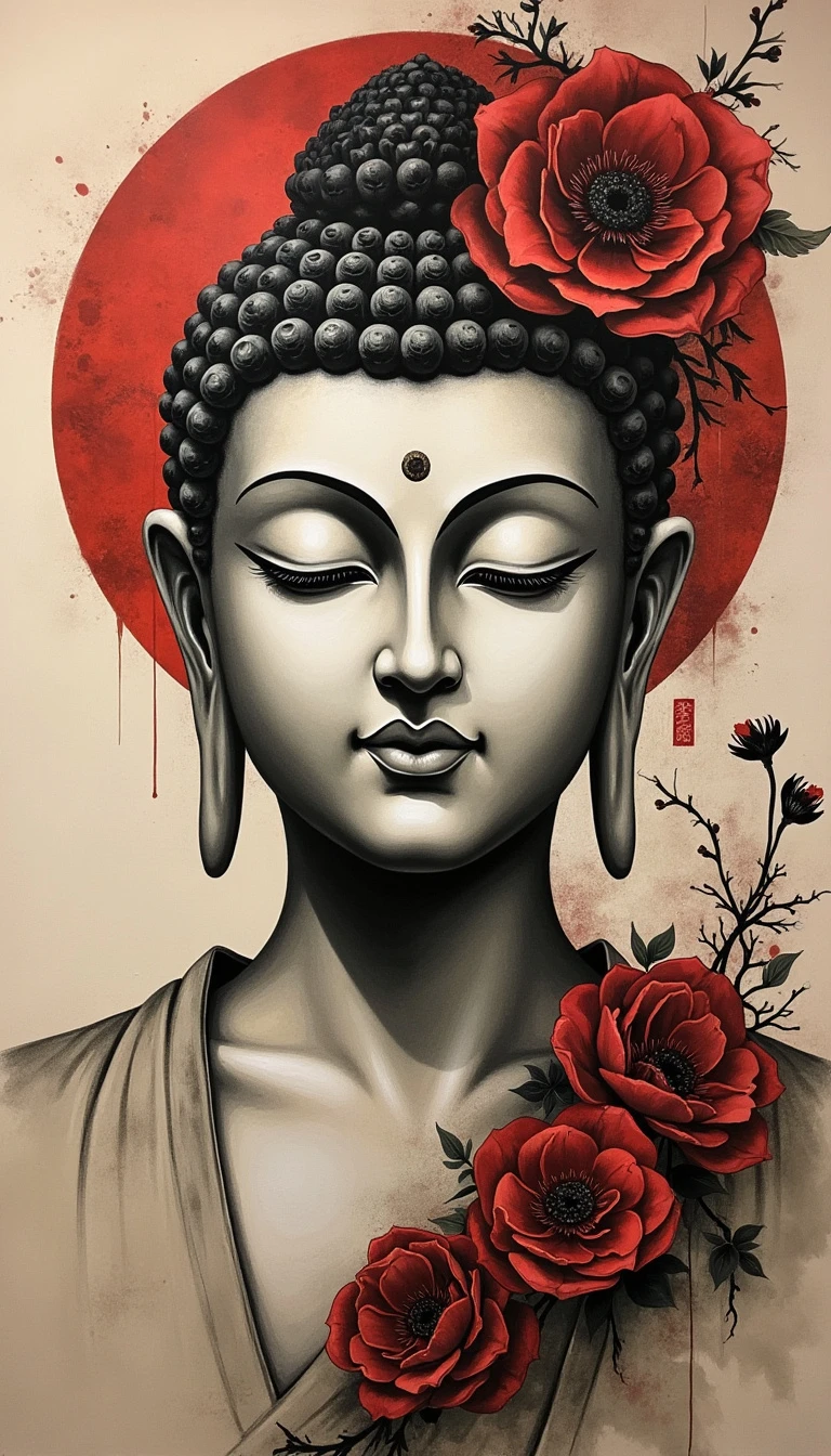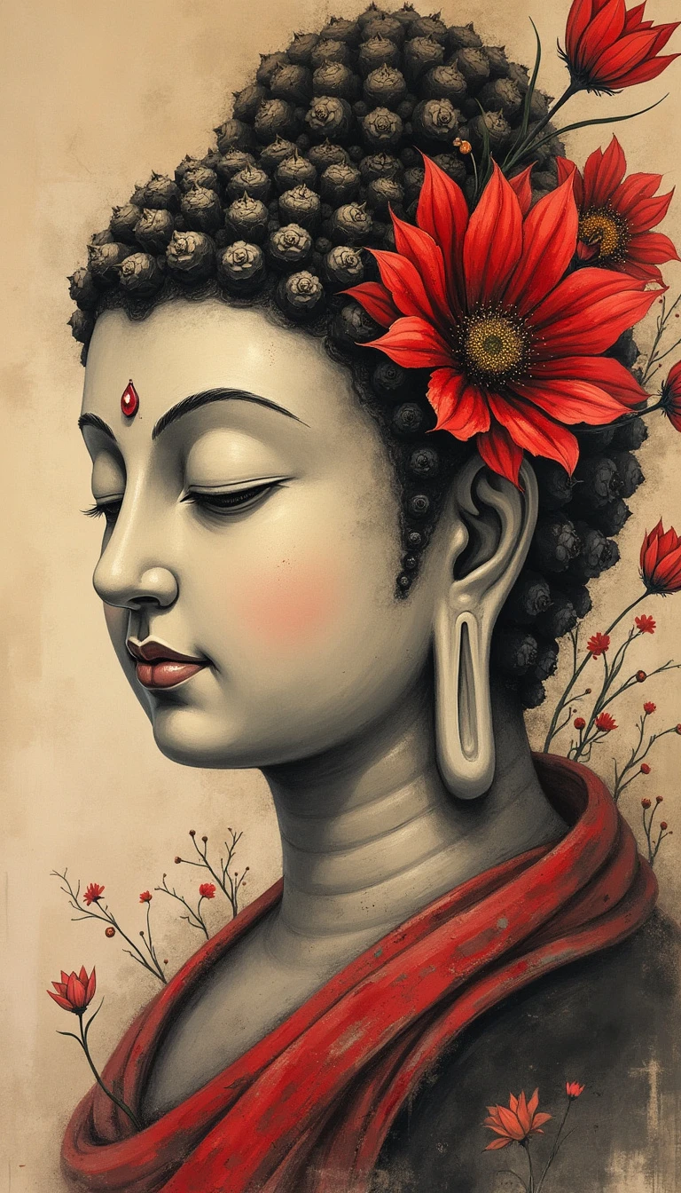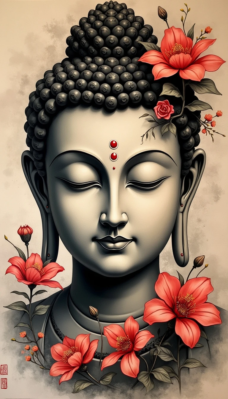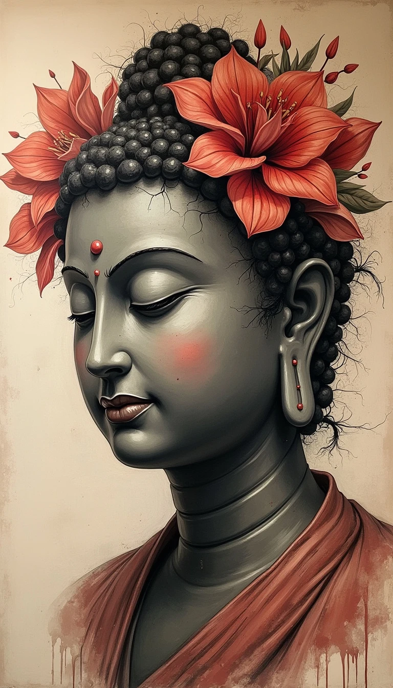 a drawing of a buddha with flowers on it, in the style of light black and red, serene ink paintings, concrete art, light brown and dark black, strong facial expression, meticulous design, mind-bending murals
