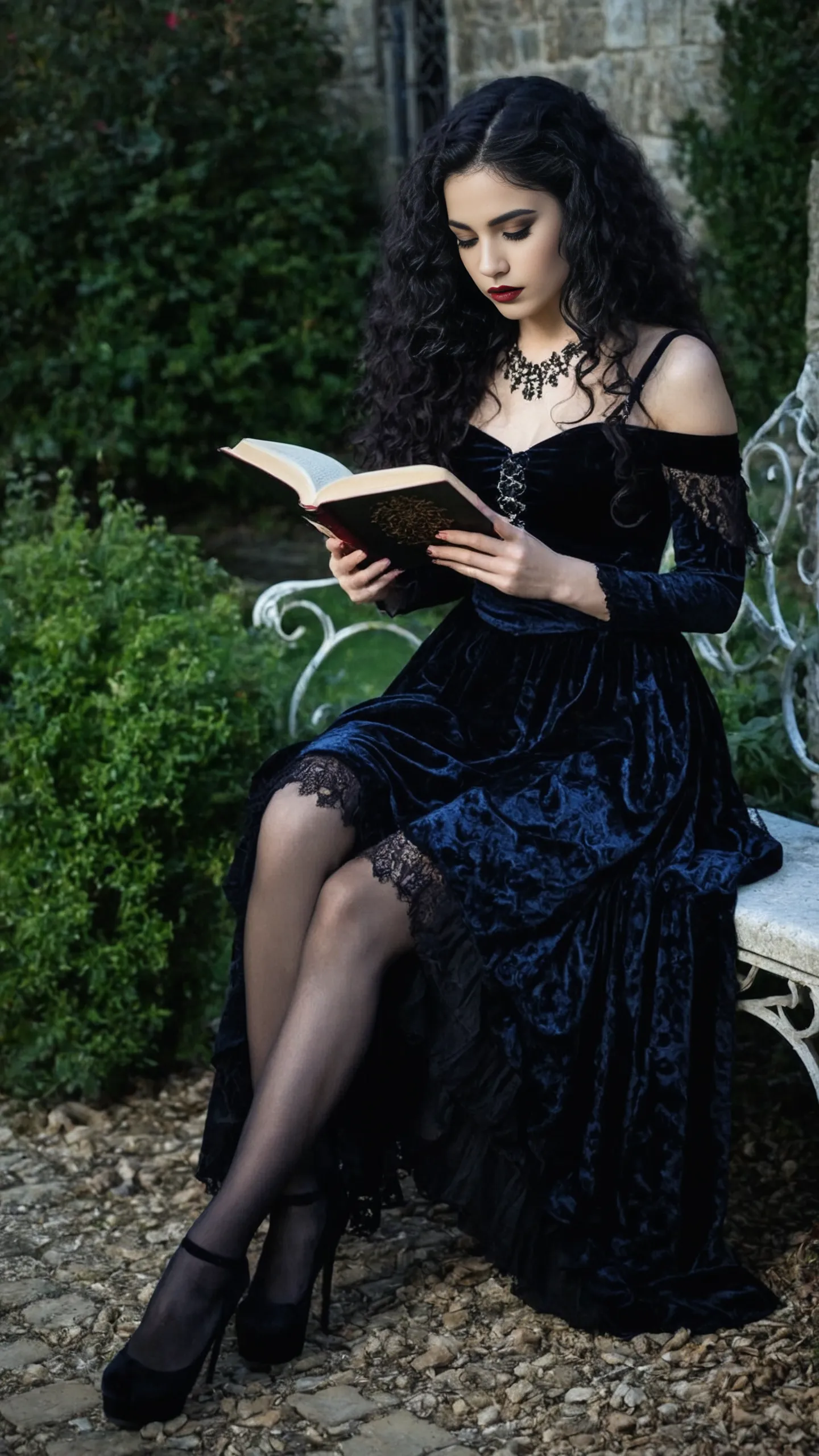 style (gothic:1.2) full body portrait, beautiful young (spanish woman:1.3) reading a book, long (curly:1.4) black hair, modest dark makeup, elegant (short gothic dress:1.4), texture (crushed velvet fabric:1.2) and patterned lace, sitting on a stone bench, background (dead garden:1.3) at dusk, mood eerie, volumetric lighting soft and cold, perspective three-quarter view, high-resolution image, highly detailed skin