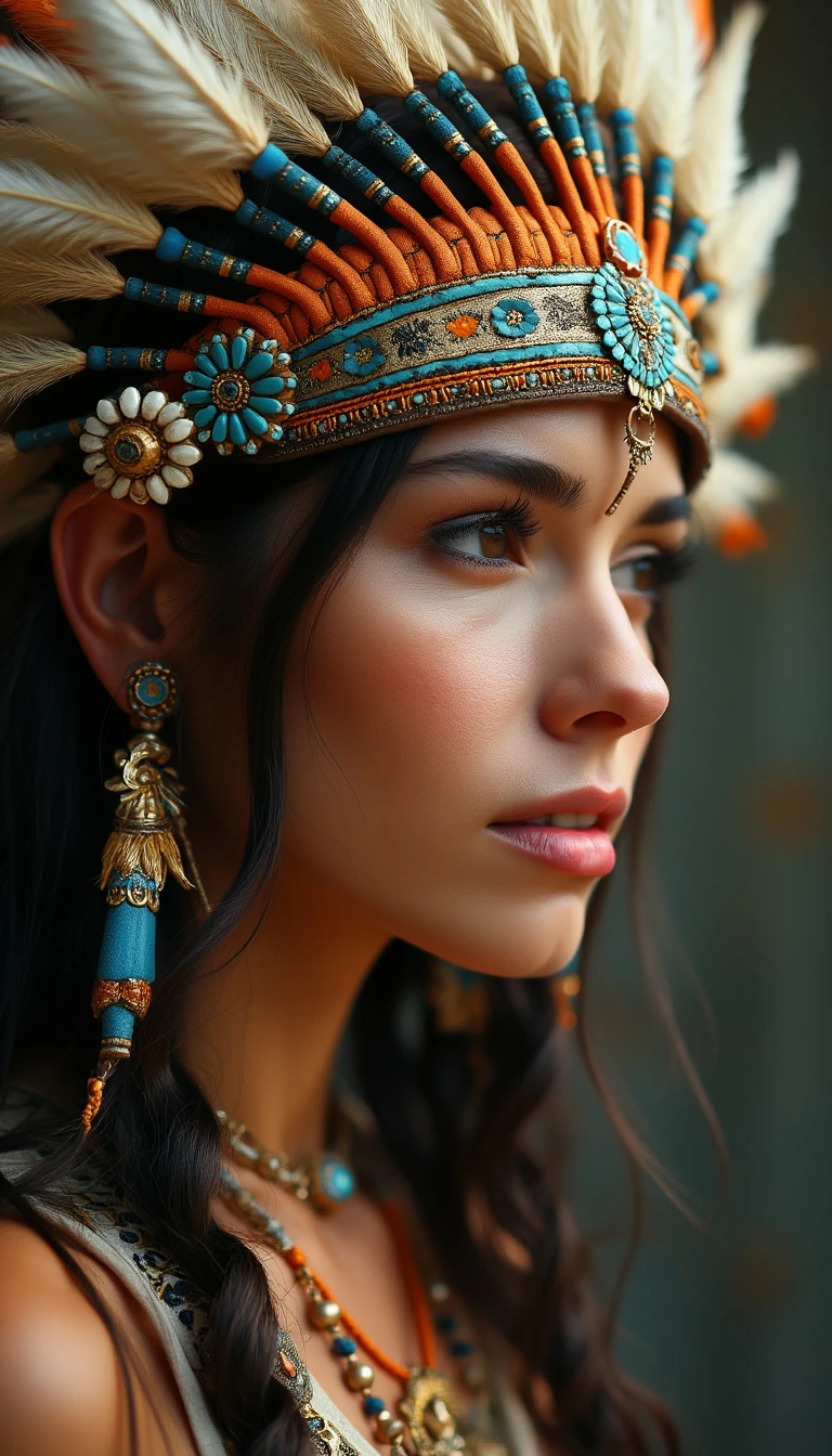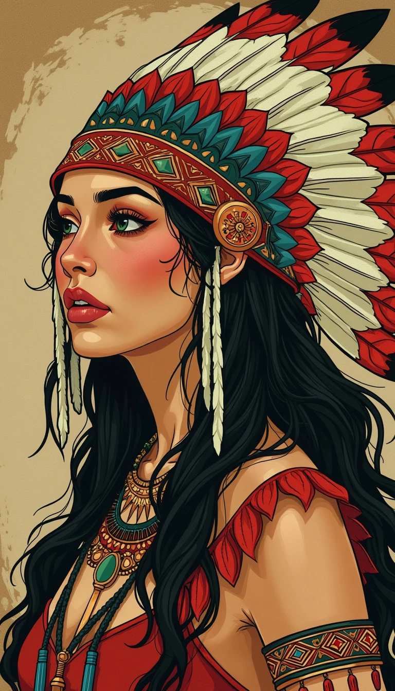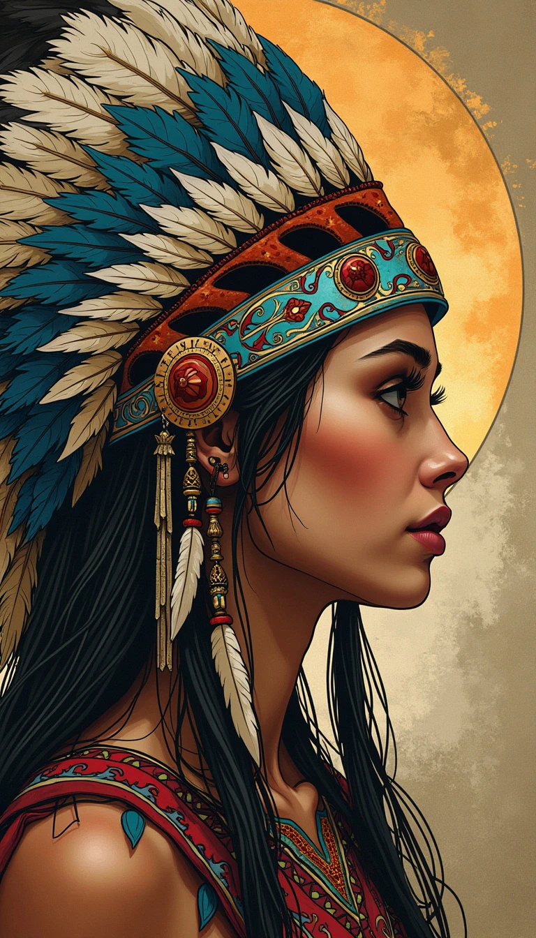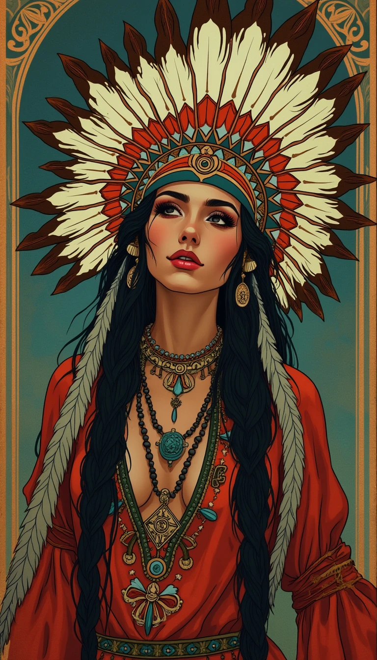 woman wearing a native american headdress; art nouveau style
