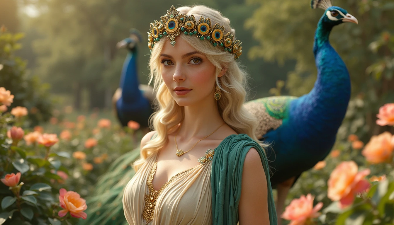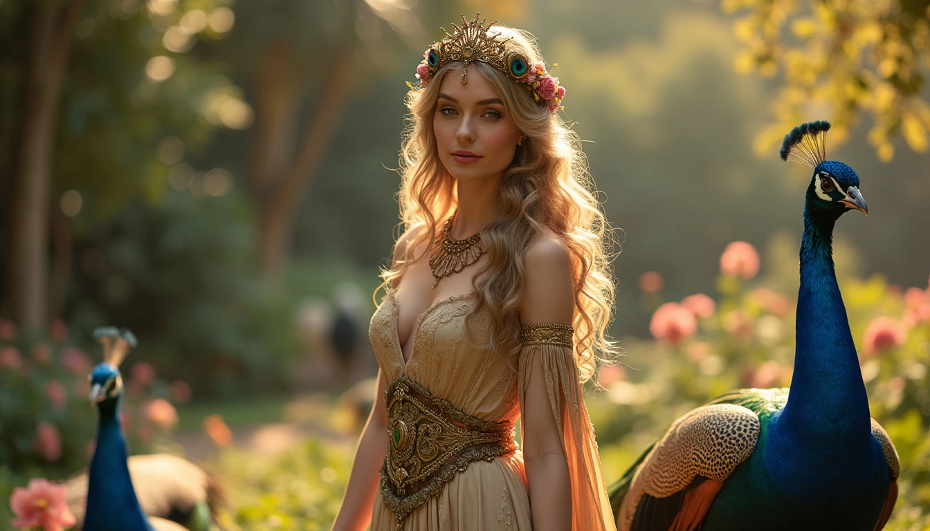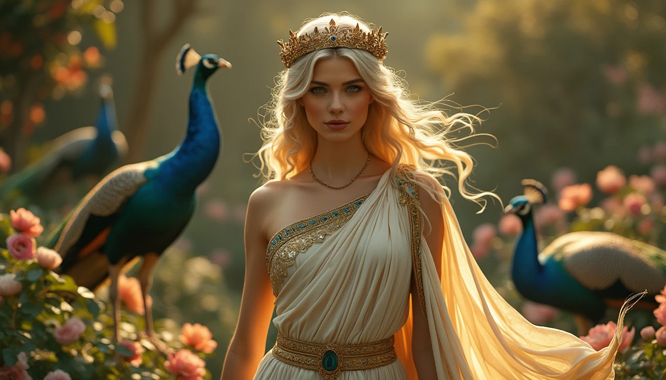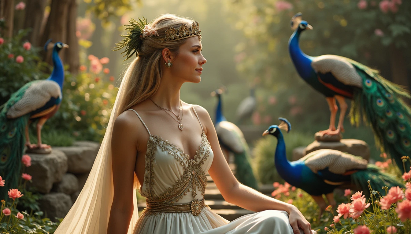 Hera, the Greek goddess of marriage, is portrayed in a serene, majestic pose. She is adorned in an elegant gown with peacock feathers and a crown, symbolizing her regal status. The background is a lush, blooming garden with peacocks gracefully strutting around her. Soft, golden light illuminates her face, conveying her grace and dignity.