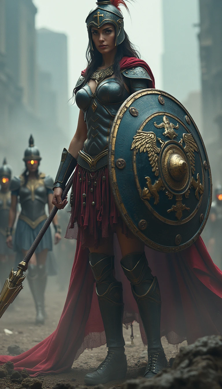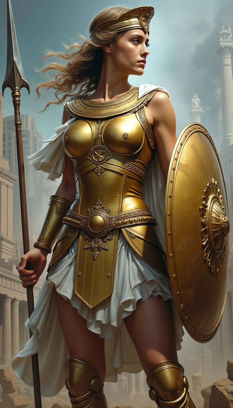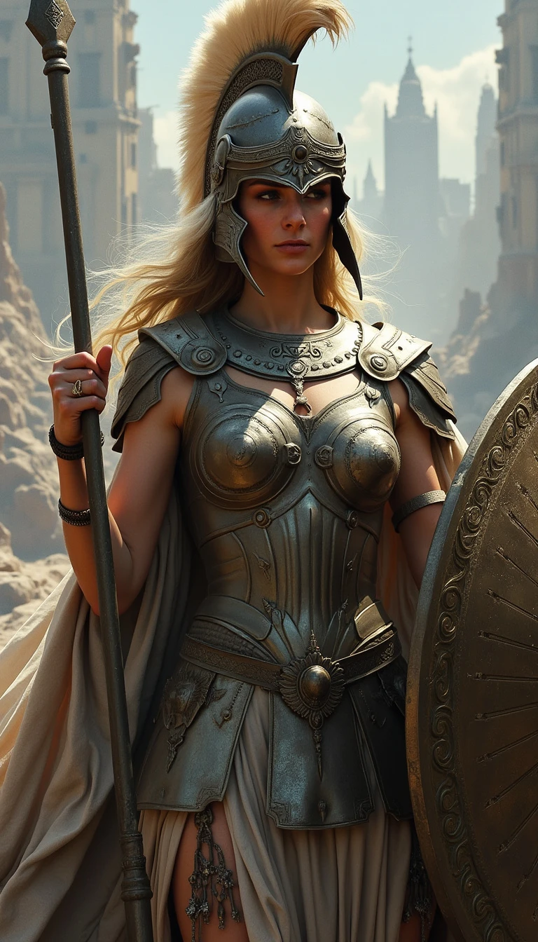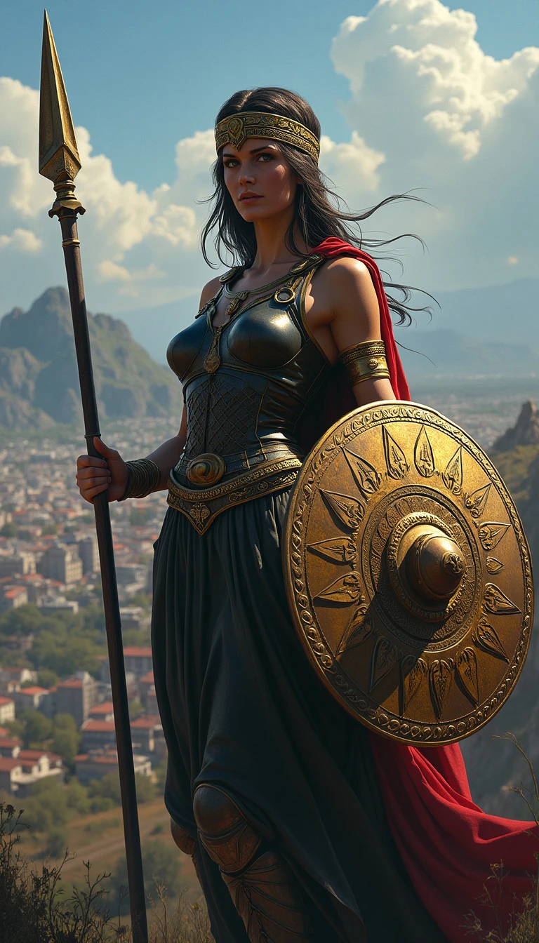 Athena, the Greek goddess of wisdom and warfare, is depicted in a strategic battlefield scene. She is wearing a latex suit, holding a shield and a spear. The backdrop includes a cityscape in the distance, symbolizing her role as protector and strategist. The image is illuminated with a cool, strategic light, emphasizing her intelligence and strength.
