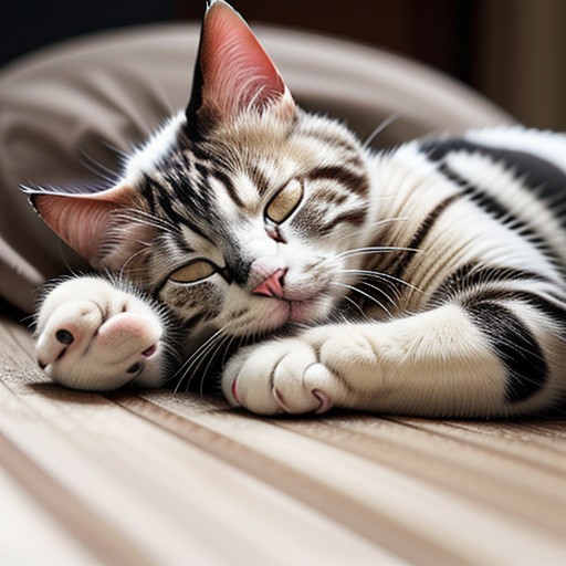 Capture a full hyper-realistic photograph of an adorable white with black patches cat, sleeping, face, belly up, cutest in civitai, chubby cat,