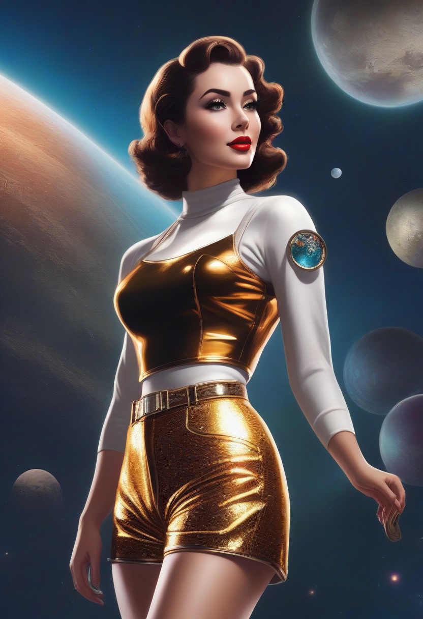 high res photo-realism, pinup, woman, muscular hourglass figure, naughty woman perky rear view; in a retro 1950's sequined sparkly Frederick's of Hollywood short shorts and crop top; utility belt, space helmet short hair, boots, great legs, healthy bosom, very smooth, detailed, perfect anatomy, smiling, exotic look, vibrant colors, sci-fi background, retrofuturism, space opera,