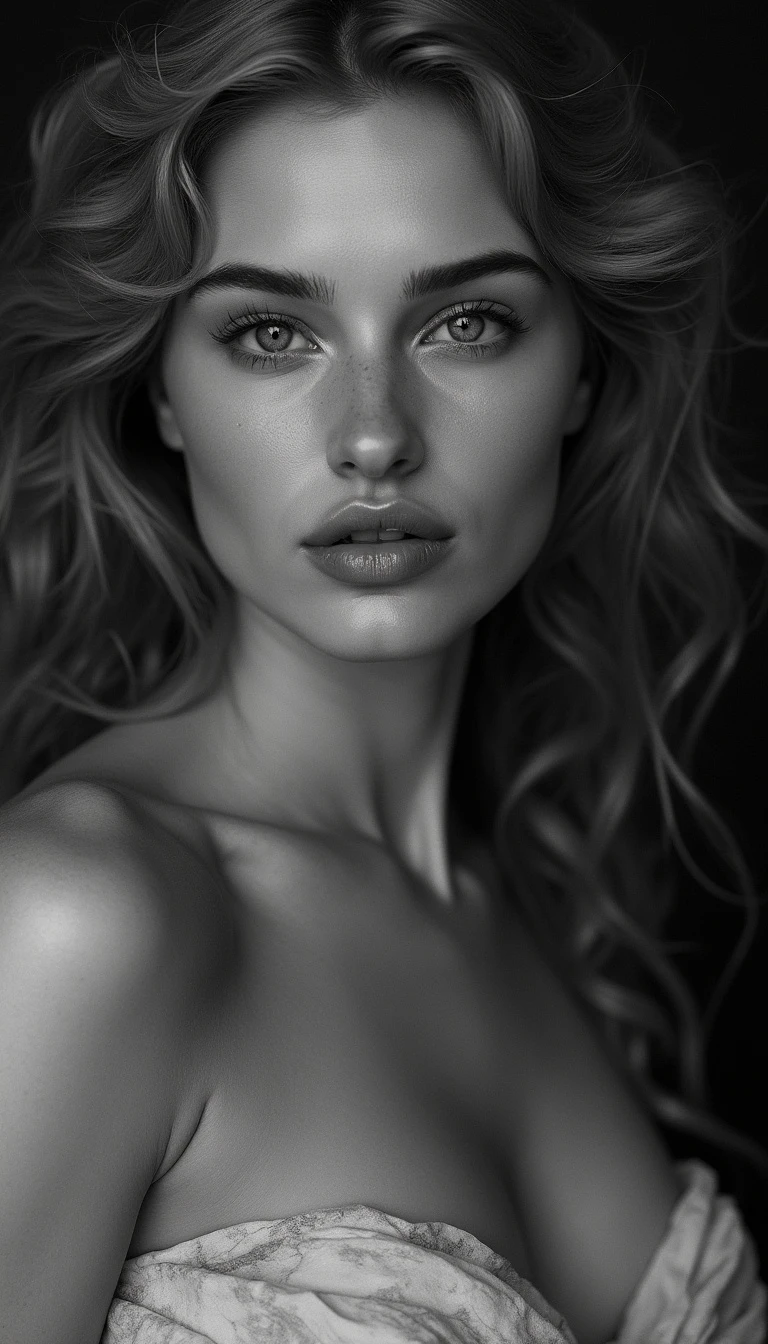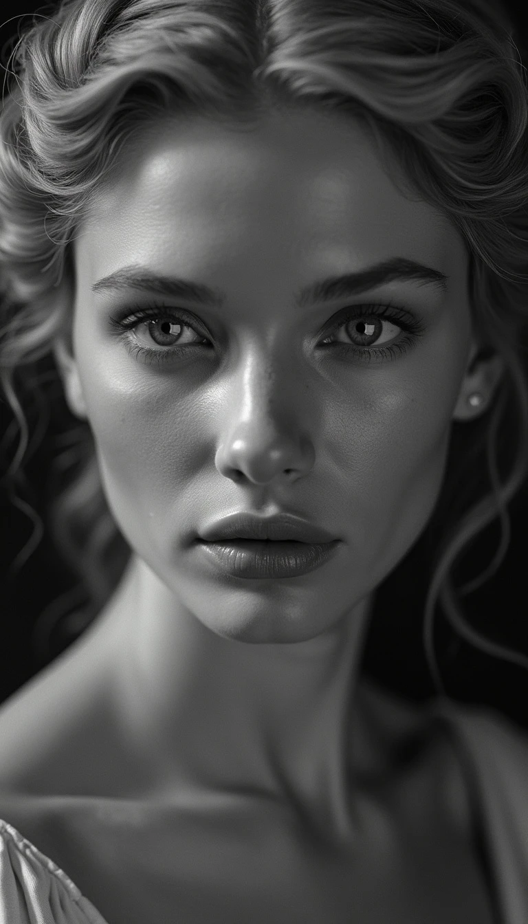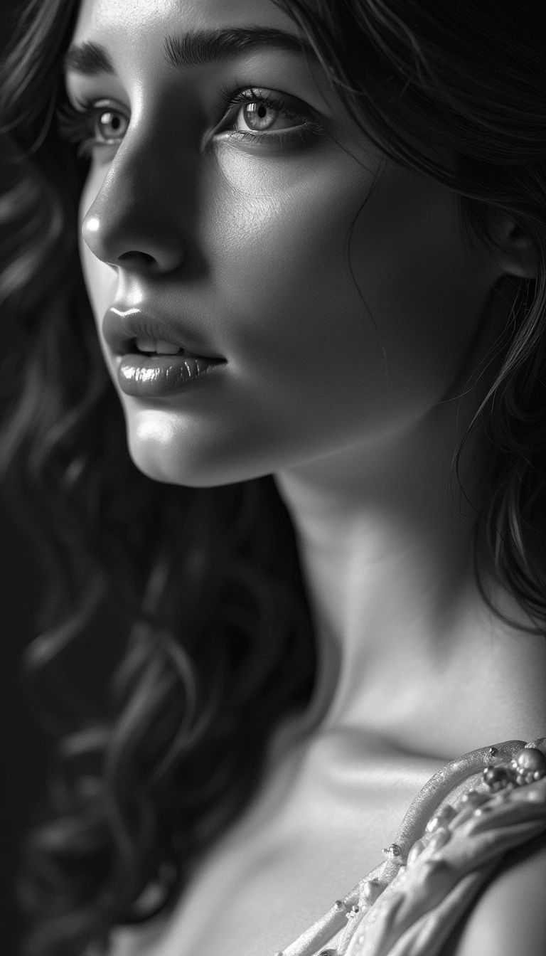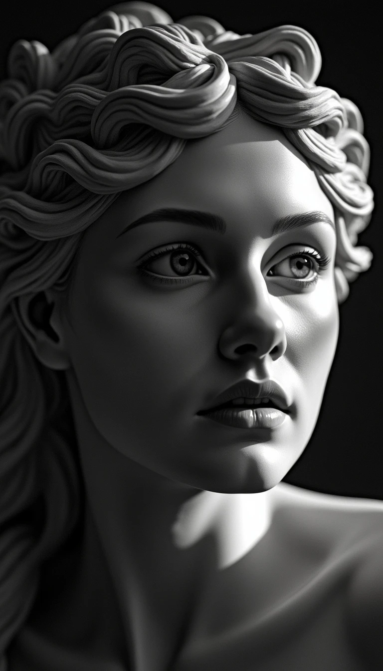A black and white photograph of Aphrodite, the Greek goddess of love, emphasizing contrast and texture. Her features are illuminated by a soft, dramatic light that casts gentle shadows, adding depth and character to her expression. The monochrome palette enhances the timeless elegance and subtle emotions reflected in her eyes, evoking a sense of divine mystery and allure