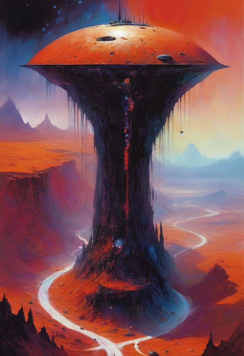 best quality, masterpiece, painting, concept art, ((((High angle From avove, camera from above, Bird's-eye view, aerial shot view)))), In the heart of the absurdes, a giant black hole consumed fantasy village.deadly void,swirling,attraction,interaction,low gravity,scifi dark fantasy,vibrant colors,dramatic,tragic,melancholy,dark dream,cosmic horror,dreamscape,professional,perfection,visually stunning,mesmerizing,disturbing,highly detailed, intricate,painted in high resolution,close-up, primary colors, no gradients, illustration, (no humans:1.3) <lora:John Harris Style:0.8> John Harris Style page