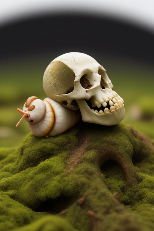 A close up of a snail with a human skull shell, mossy, flowers, colorful, sparkling