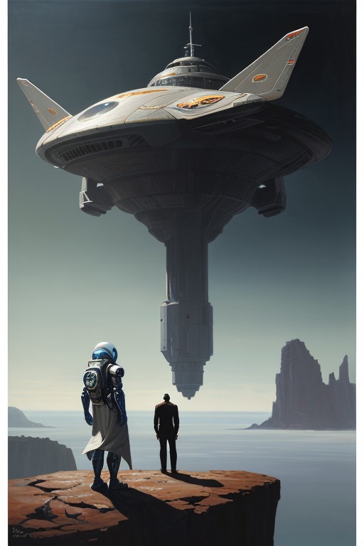 An oil painting of a futuristic spaceship floating overhead on an alien planet while a small robed man stands on a cliff in the foreground, the man is facing away from the viewer, solo man, pulp sci-fi vibes