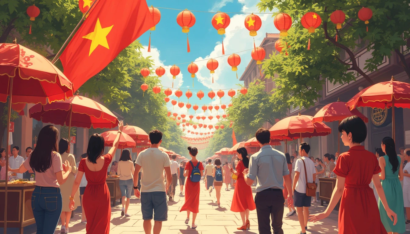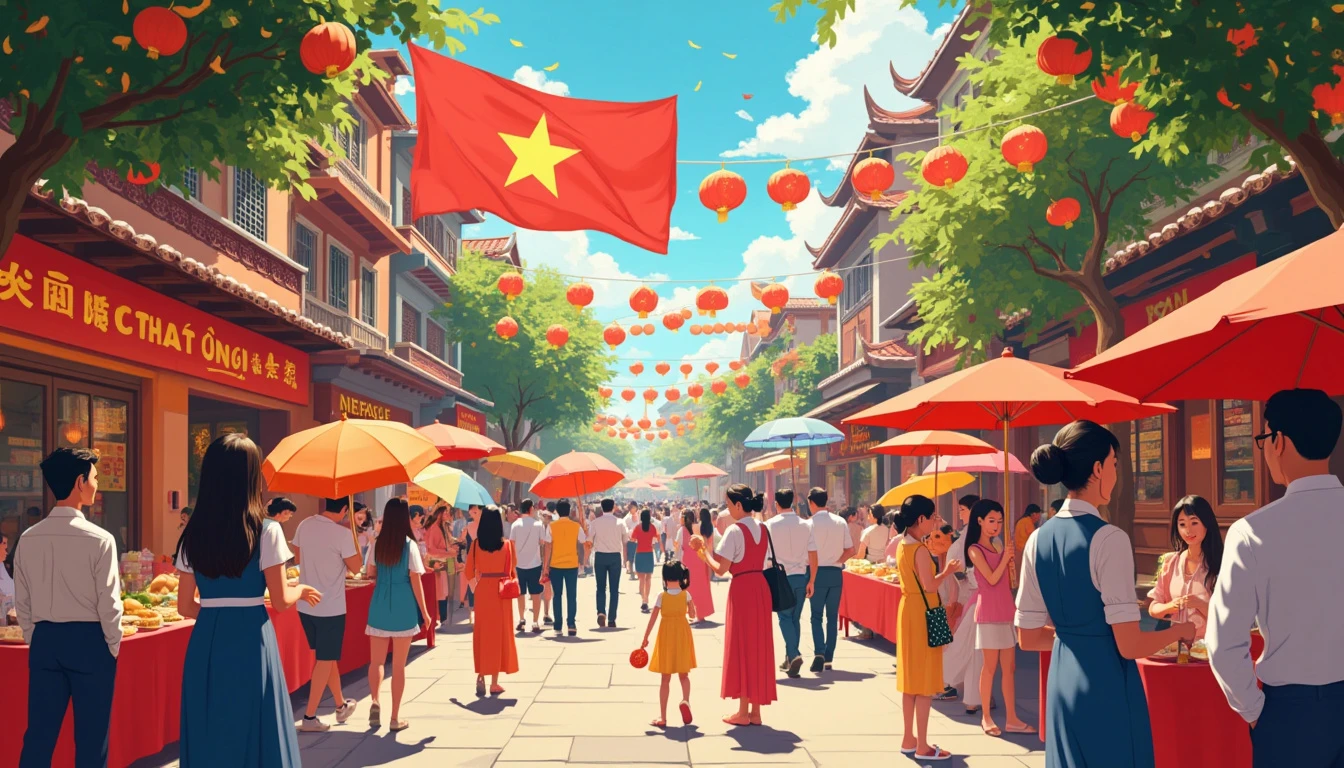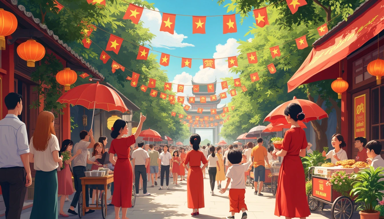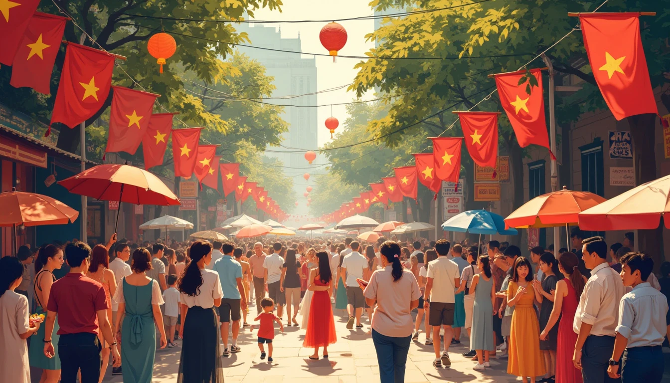 Viet Nam Celebration in Hanoi's Old Quarter: A bustling scene in Hanoi's Old Quarter during Vietnam's National Day on September 2nd. People waving red flags with yellow stars, traditional Ao Dai dresses, colorful street decorations, and children playing with paper lanterns. The streets are filled with the aroma of street food, like Pho and Banh Mi. The scene is captured in a style reminiscent of Edward Hopper, focusing on the lively interactions and vibrant colors of the celebration