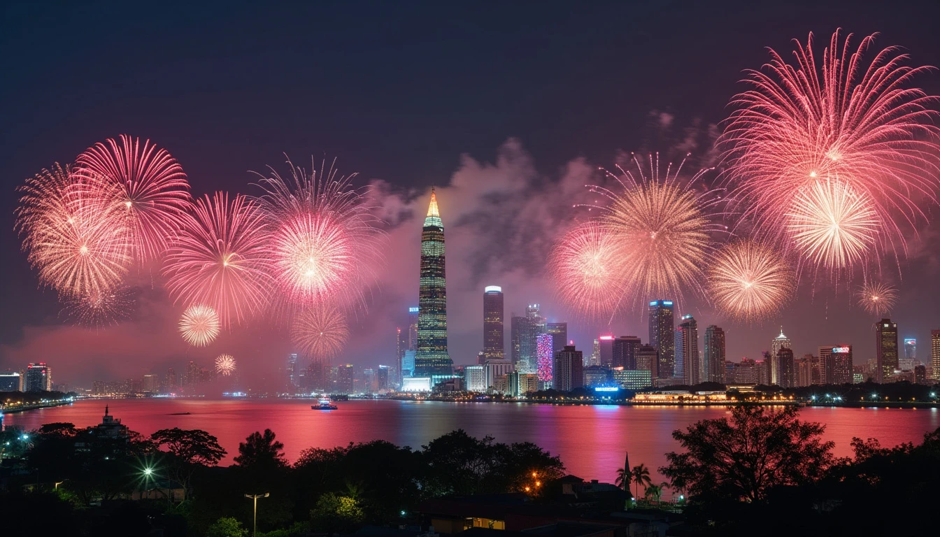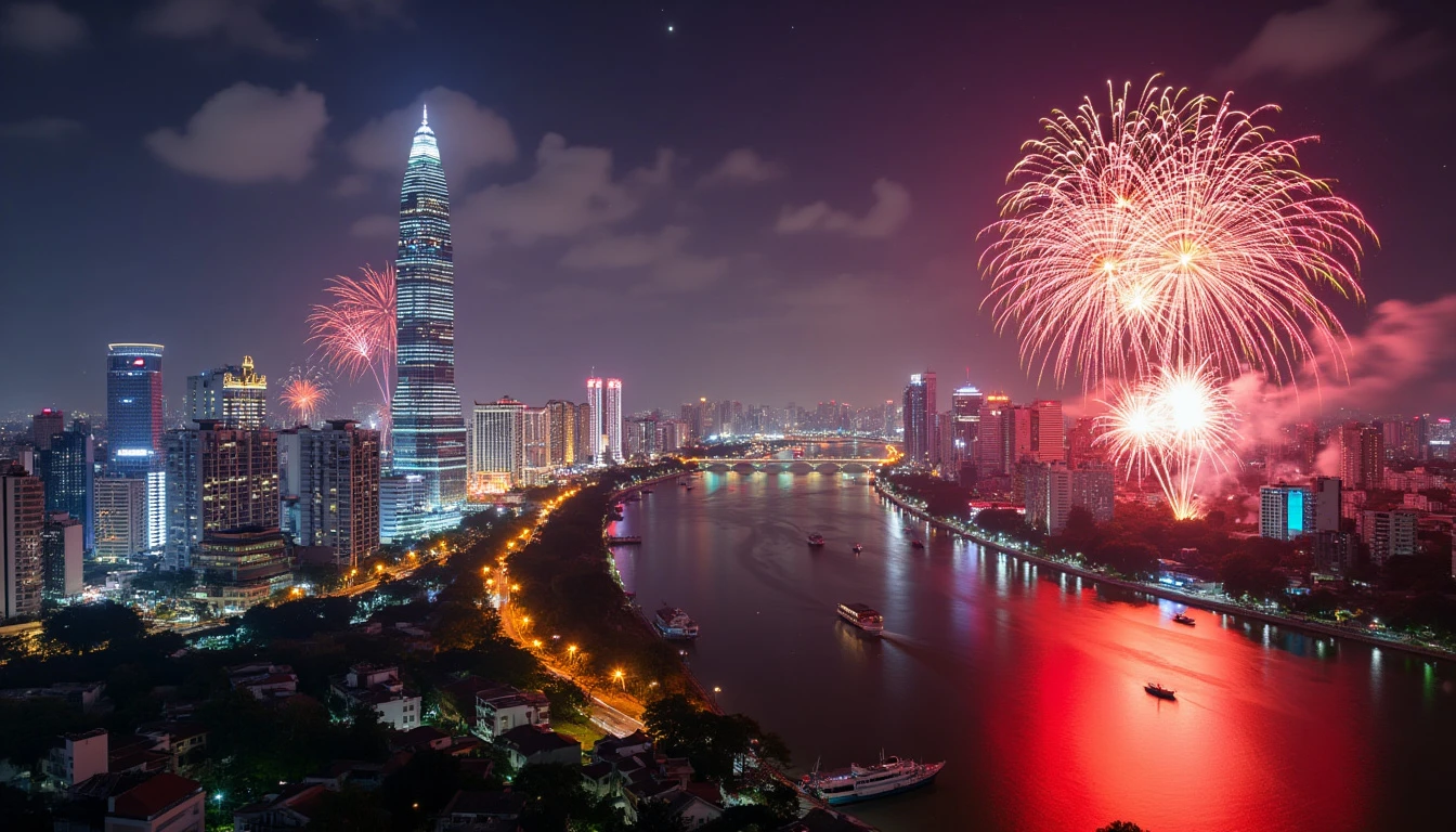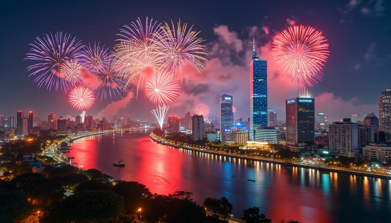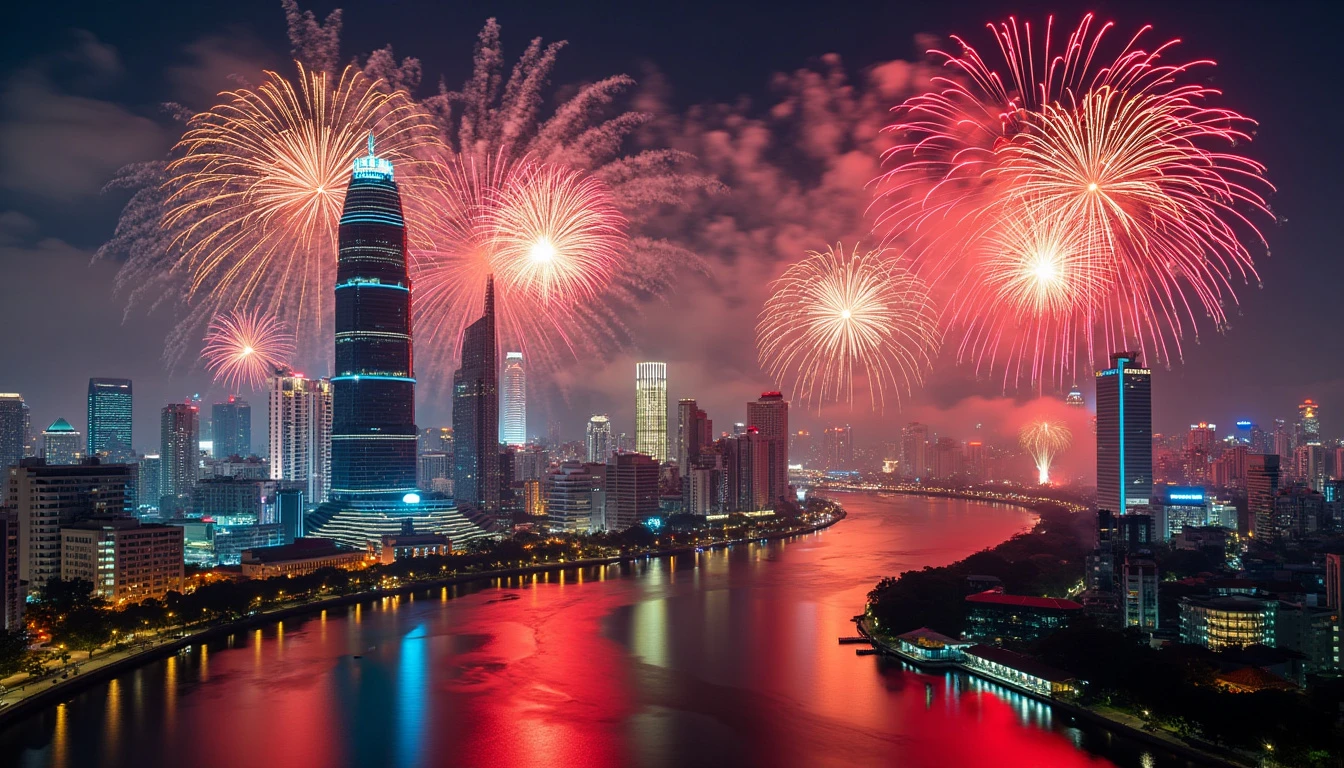 Ho Chi Minh City Skyline with Fireworks: A panoramic view of Ho Chi Minh City’s modern skyline illuminated by a spectacular fireworks display on Vietnam's National Day. The Saigon River reflects the colorful explosions, and the Bitexco Financial Tower stands tall amidst the celebration. The style is a combination of Ansel Adams' black and white photography for the cityscape details with a burst of colorful fireworks inspired by Yayoi Kusama’s polka dot style