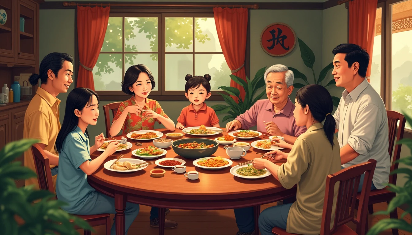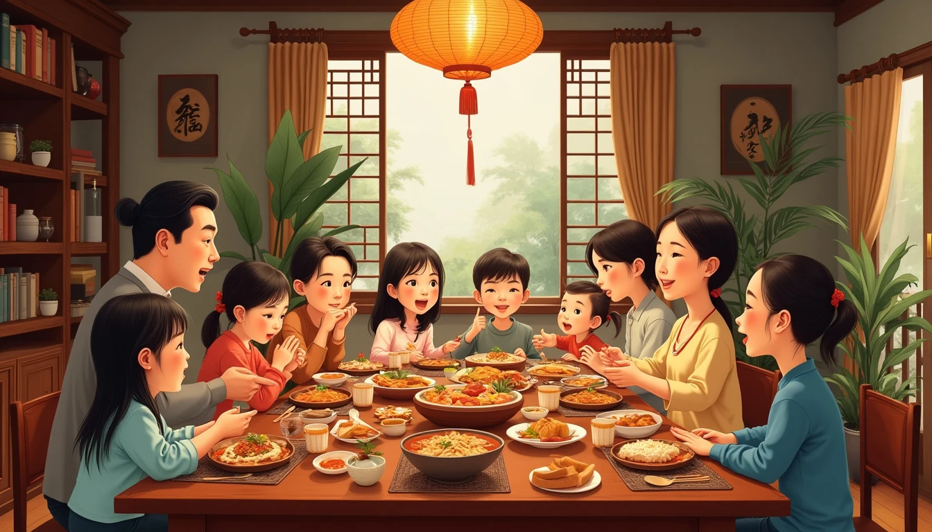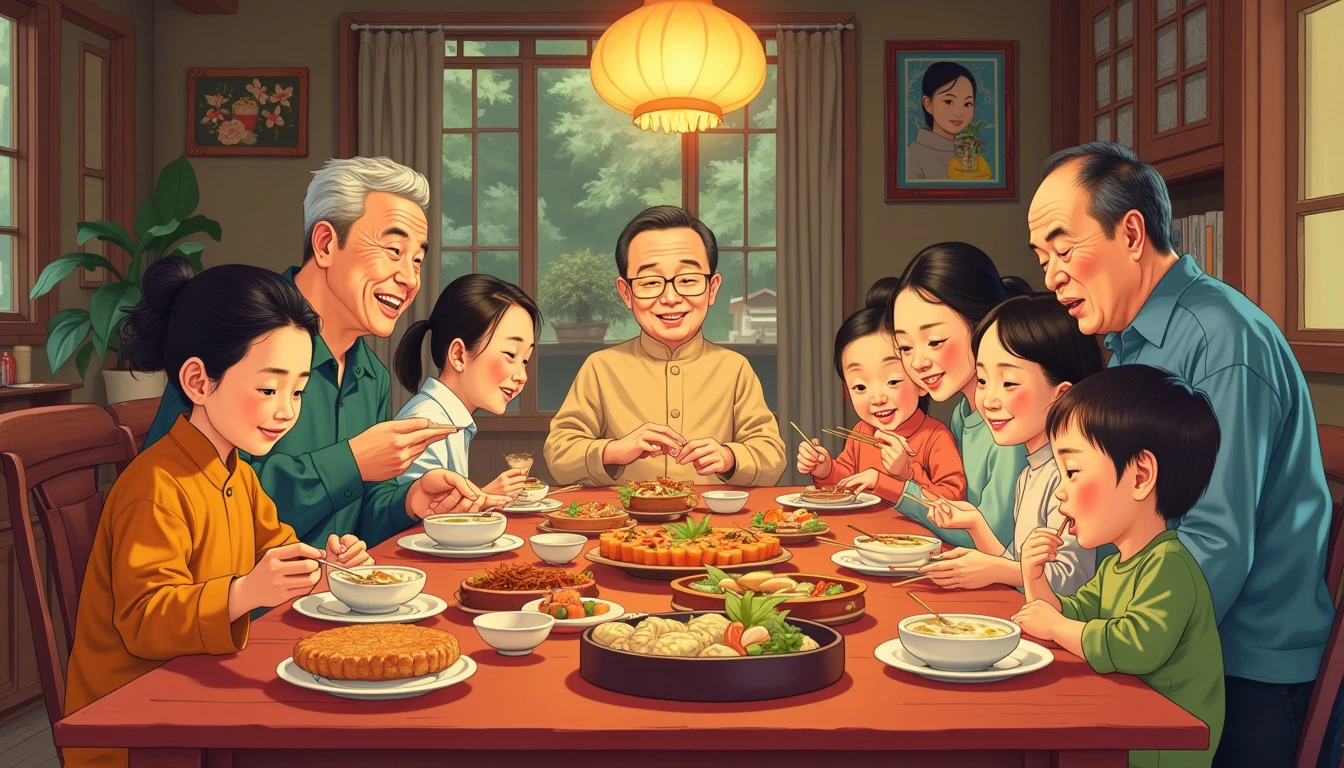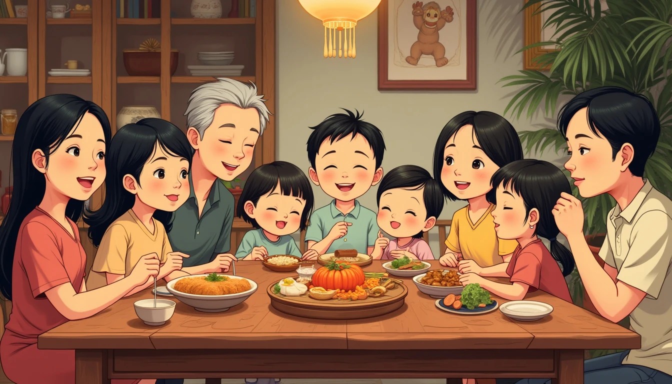 Traditional Vietnamese Family Gathering: A heartwarming scene of a multi-generational Vietnamese family gathered around a table for a celebratory meal on National Day. The table is filled with traditional dishes like Nem, Bun Cha, and Banh Xeo. The setting is a cozy, rustic Vietnamese home with wooden furniture and ancestral portraits. The art style is inspired by Norman Rockwell's classic Americana, but with a distinctly Vietnamese cultural twist --v 6.1