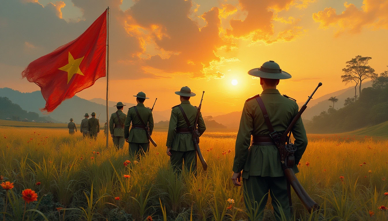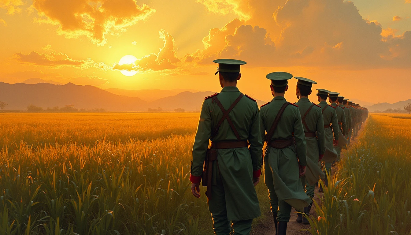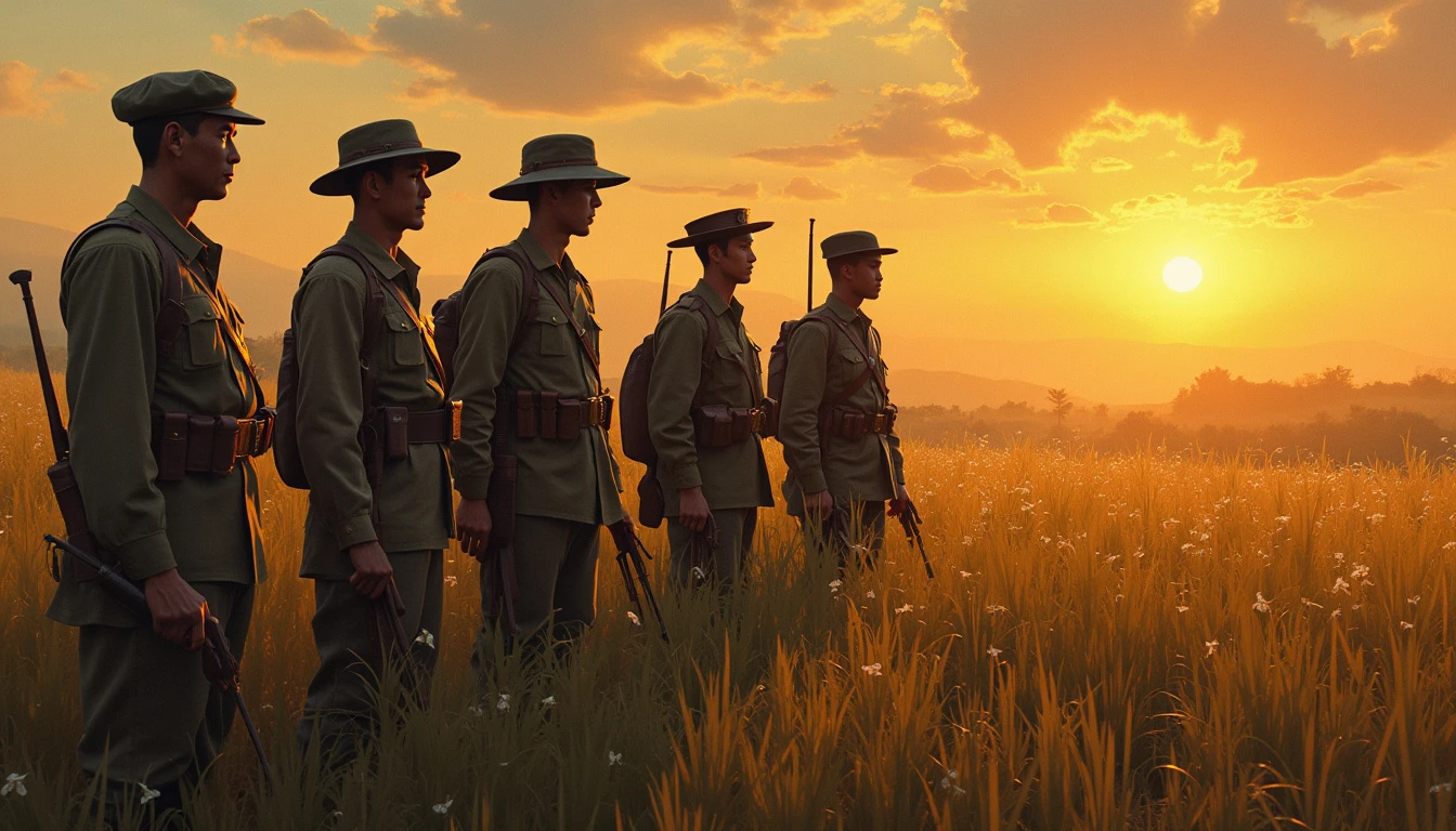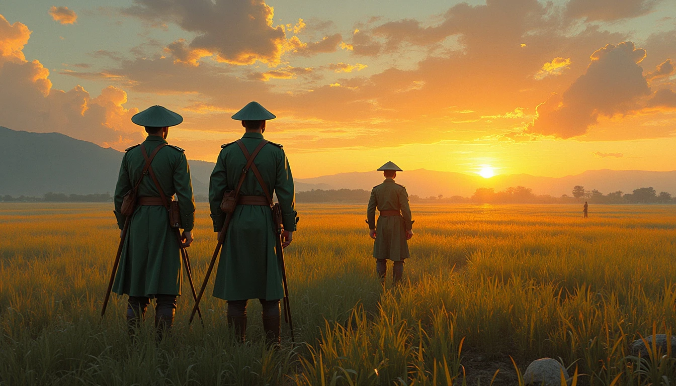 Vietnamese Soldiers in Historical Uniforms: A tribute to Vietnamese soldiers from the First Indochina War era, wearing traditional military uniforms, standing in a field of rice paddies with the sun setting behind them. The scene captures the serene yet resilient spirit of the Vietnamese people. The art style is a mix of Albert Bierstadt’s dramatic landscape lighting and Gustav Klimt’s intricate detailing