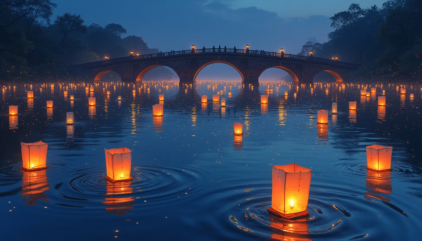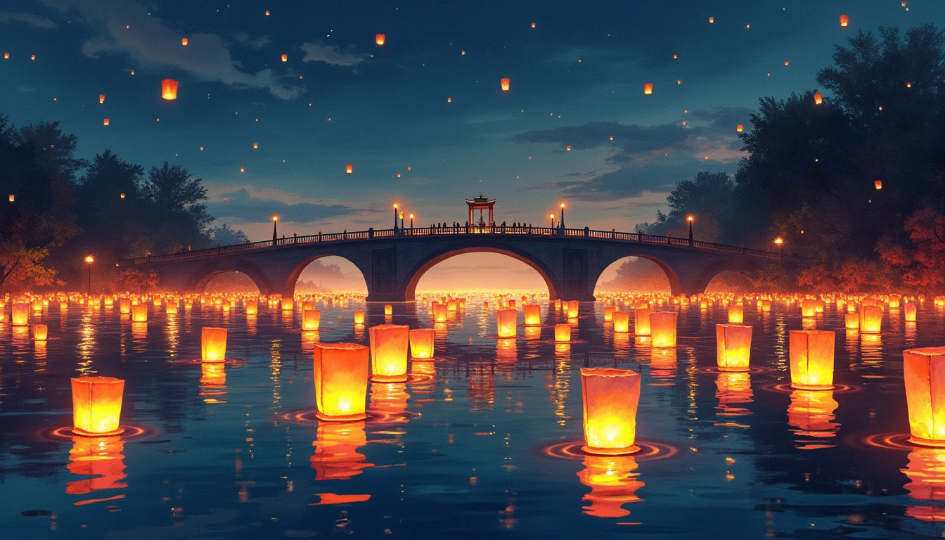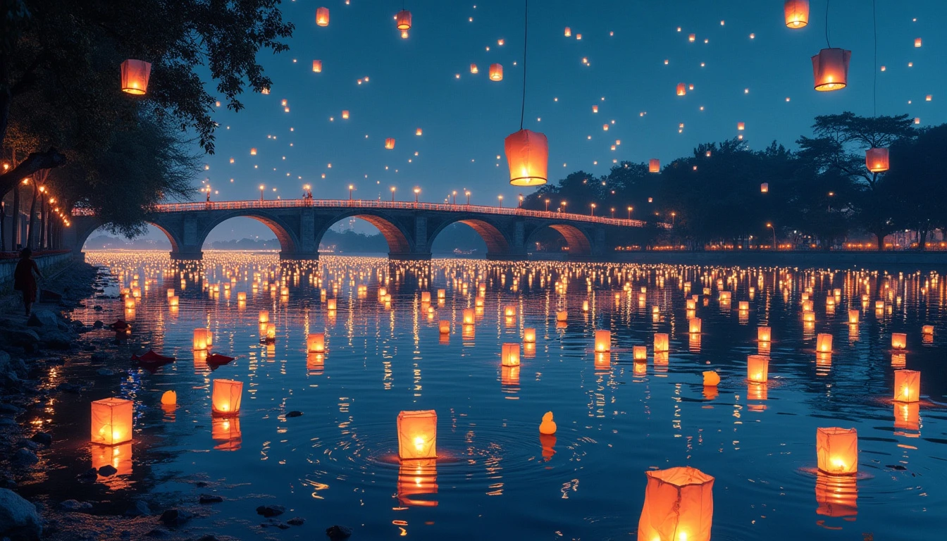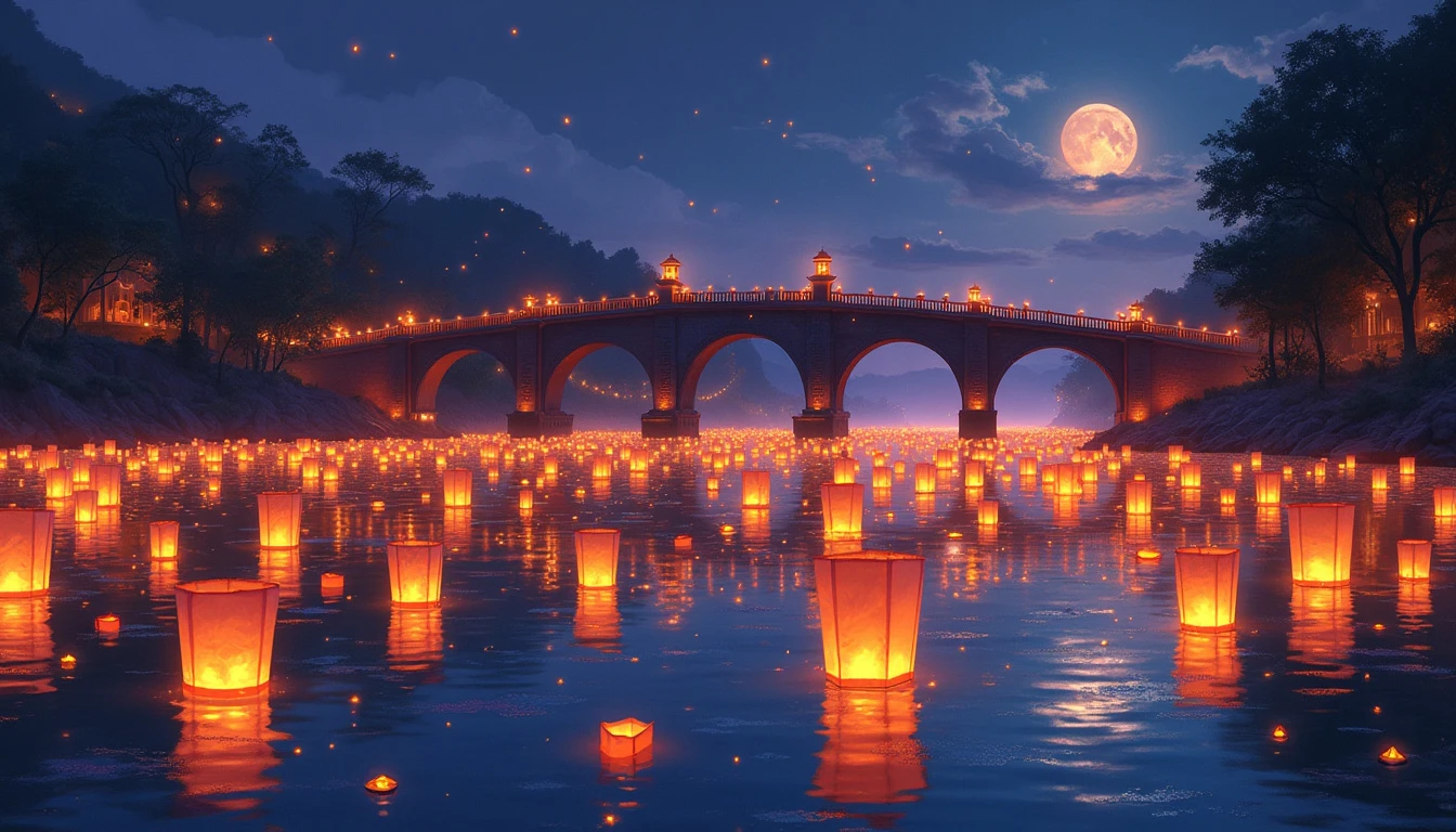 Floating Lanterns on the Perfume River, Hue: A serene, mystical night scene of the Perfume River in Hue, where thousands of floating lanterns drift gently on the water, each one symbolizing a prayer for peace and prosperity. The scene is set against the backdrop of the ancient Trang Tien Bridge, softly illuminated by the lanterns’ glow. The art style is influenced by Hiroshi Yoshida’s Japanese scenic watercolors, blending tranquility and vibrant color contrast