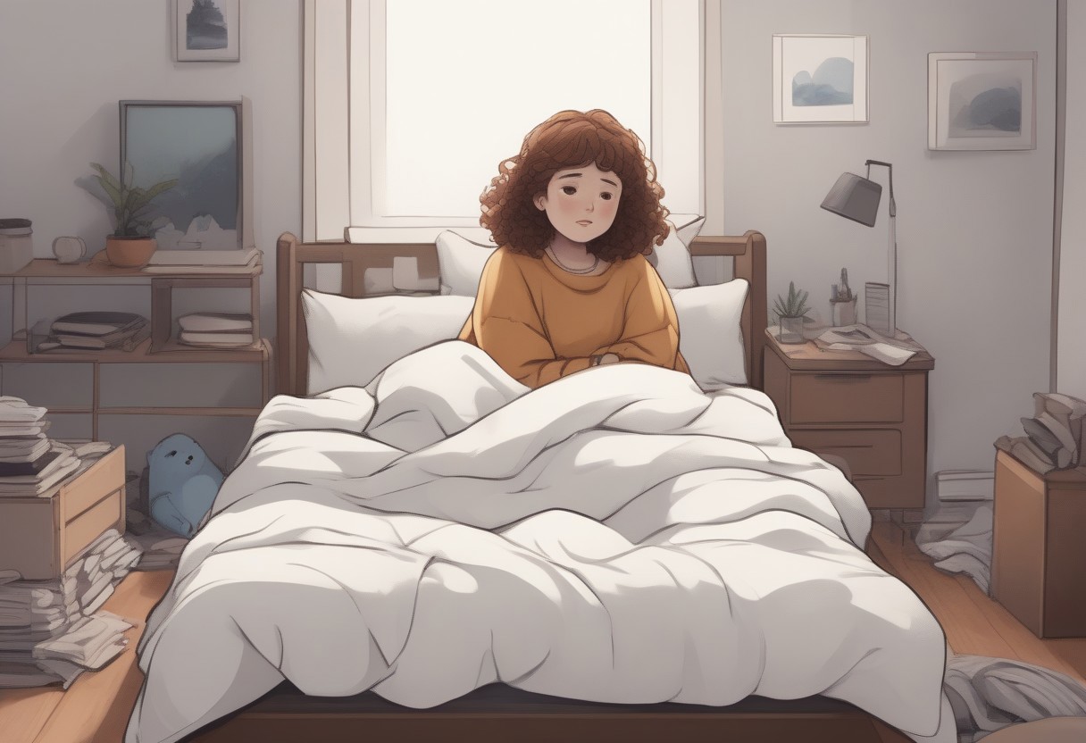 1girl, chubby, light brown hair, curly hair, casual clothes, sleepy, tired, gamer bedroom, laying bed, a pile of blankets around her, cartoonist art, masterpiece, 4k, best quality