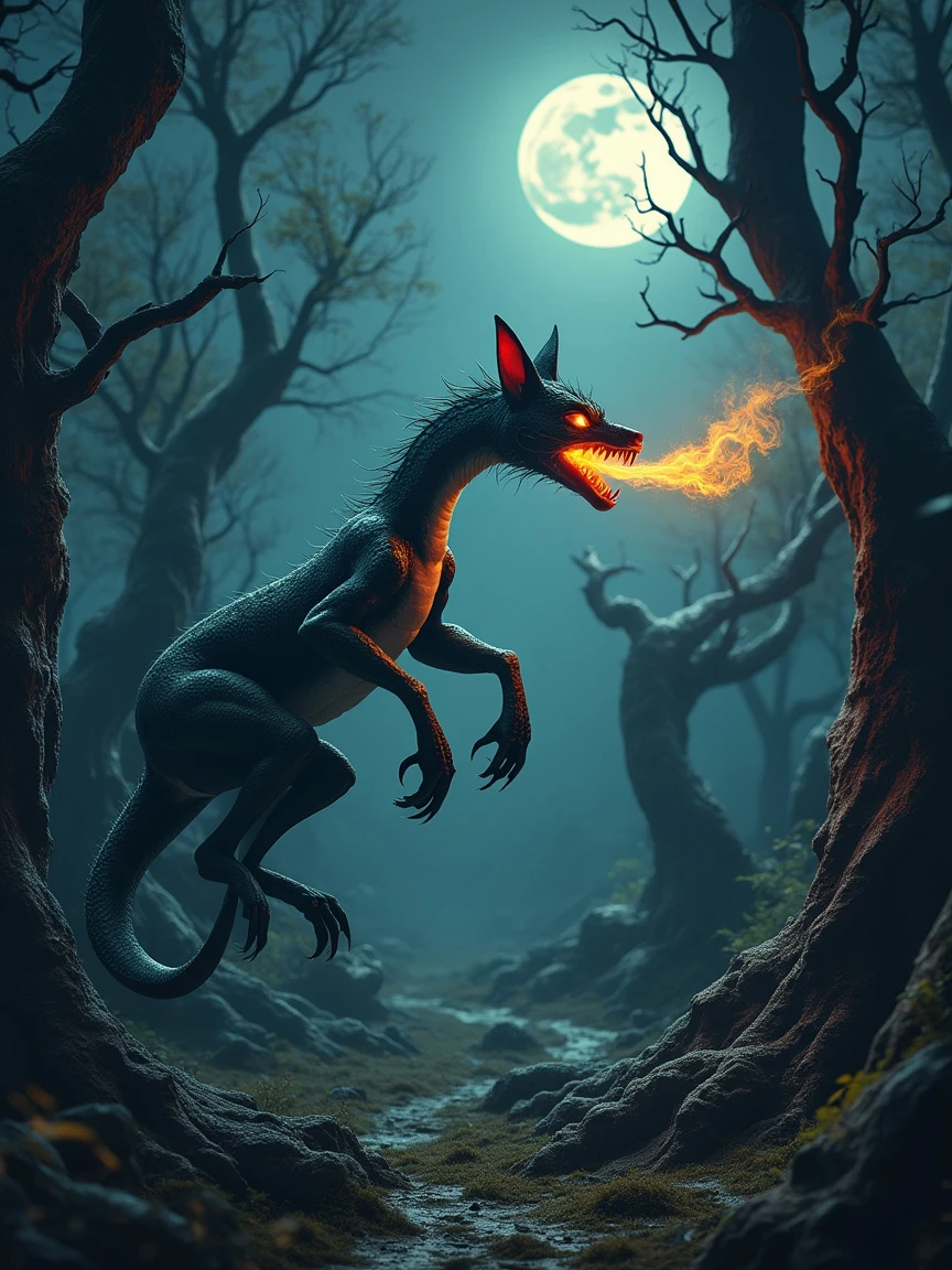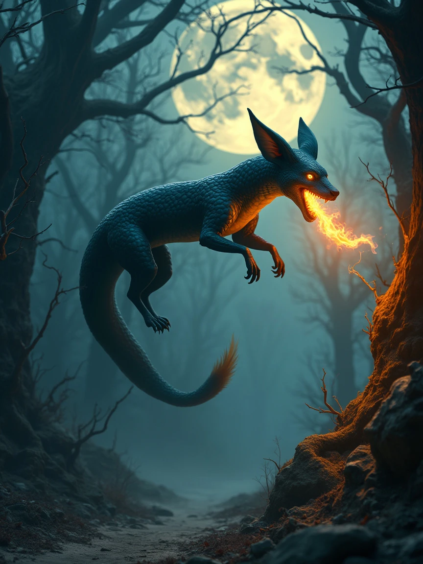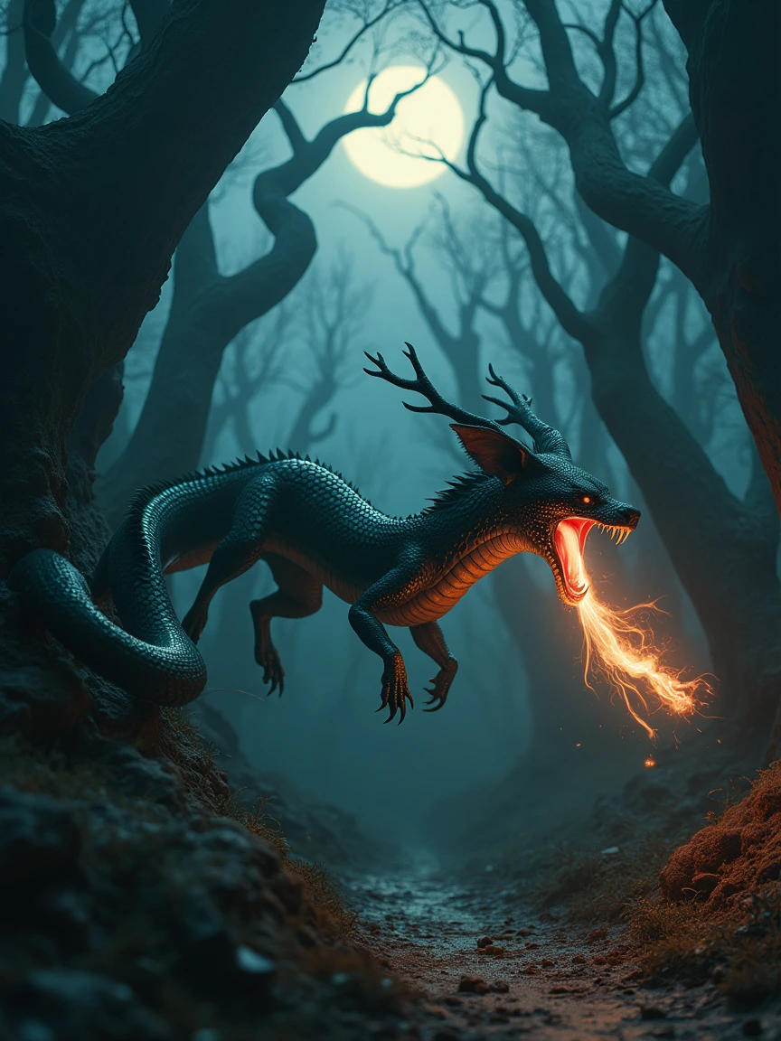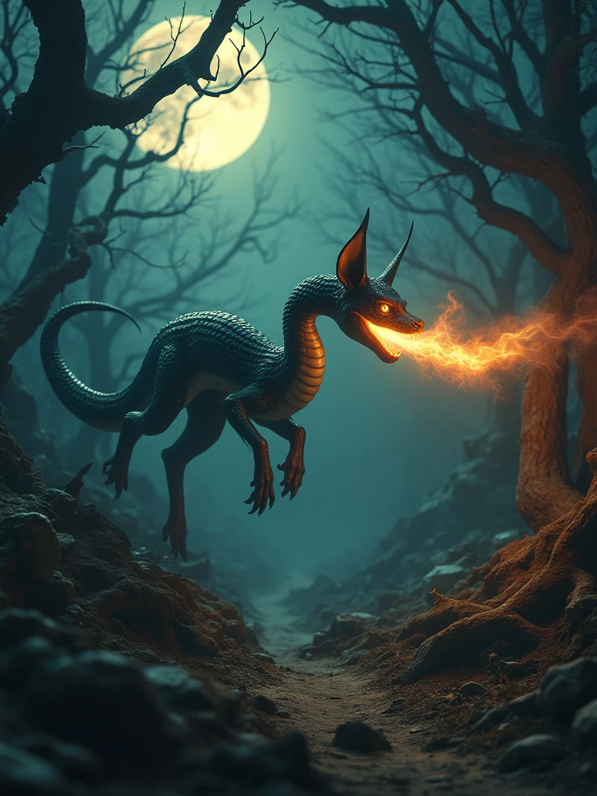 A surreal photograph of a mythical creature with the long, sinuous body of a snake and fox-like ears, gliding through a dense, mystical forest of twisted, gnarled trees on a moonlit night. Its dark scales blend into the shadows, and its fiery tongue flickers, casting an eerie glow that illuminates the strange, surreal shapes of the forest. The creature moves silently across all terrains, with the forest appearing almost alive, its branches reaching out like hands in the moonlight. The surreal style emphasizes the creature's swift, ghostly movement and the mystical atmosphere of the forest. Created Using: surreal photography, high contrast lighting, sharp focus on textures, dramatic shadows, vibrant highlights, ethereal glow, dreamlike composition.