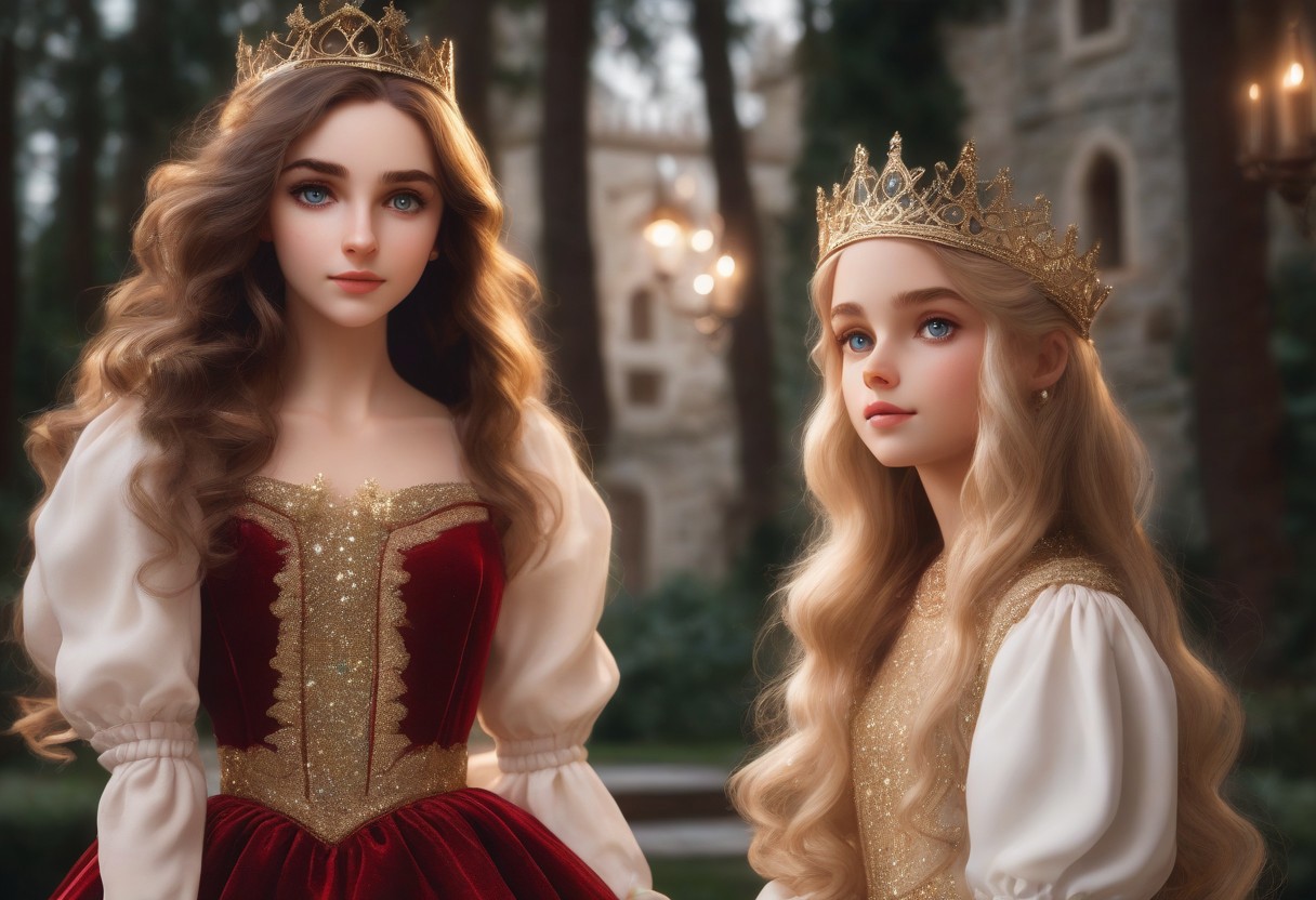 The're two girls. Realistic style. (relaxed hands and thin hands fingers too:1.10), (she touches the star with one index finger hand:1.10), (the other girl touches the star too with her index finger:1.10), (five fingers:1.10), AI_girls dolls, (different girls:1.20), european ethnicity, (long princess velvet red dress with gown:1.10), (long princess gold dress with gown that sparkles:1.10),(visible eyes, noses and mouths:1.10) princesses, oval face, (beautiful sparkling precious princess crowns:1.10), (night time with shooting stars:1.09), and (one full-moon:1.05), (moon rays on them:1.09), beautiful cute princesses by the (flowing long wavy brown thick hair until waist:1.10), (the other girl has flowing long blonde hair until waist:1.10), and (cute brown eyes:1.05), (the other girl has green eyes:1.05), assymetric eyes, (two eye iris:1.05), perfect eyes, (blunt bangs:1.05), (other girl with curtain bangs:1.05), they looks at you, wide smile, mouth open, (cute behaviors:1.05), shy and pure (blushing and the other princess not:1.0510), (luxury manor behind them:1.10), they're in their garden with beautiful flowers. Beautiful composition illustration. (Visible background:1.10), (visible image:1.15) fashion_theme trending. Absurd, masterpiece, artwork, trending, (23 years old) BadDream, natural skin texture & pores. RAW photo, high detailed skin, soft lighting,epic composition, Fujifilm XT3, Canon R5, film, moviem magic. (amazing cute SFX:1.15). (american piano shot:1.10).