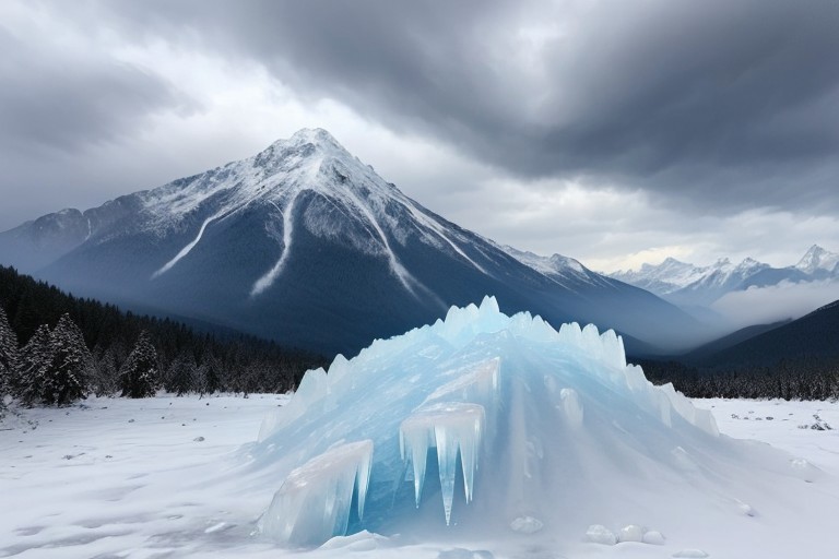 in the sky, only see blue sky and clouds, thick fluffy clouds, hailing rain, haling snow, large hail ice, forested mountain side, ((pointy ice structures))