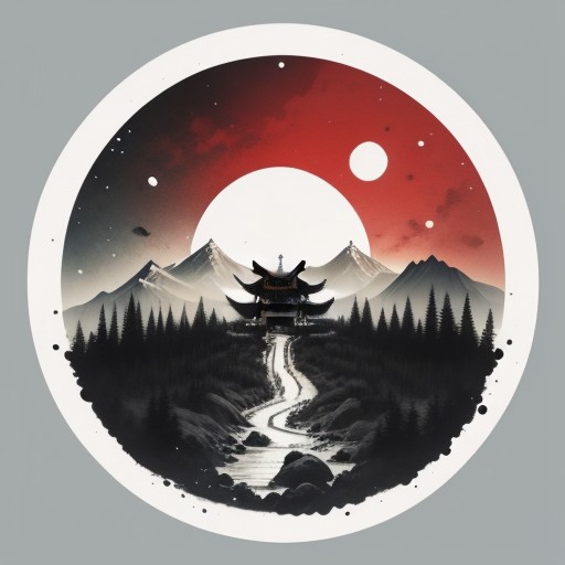 <lora:Calligraphy-ink-style-darquelilly-v1:1> calligraphyinkstyle, red color, circle shape, monk temple, top of mountain, snow, sun