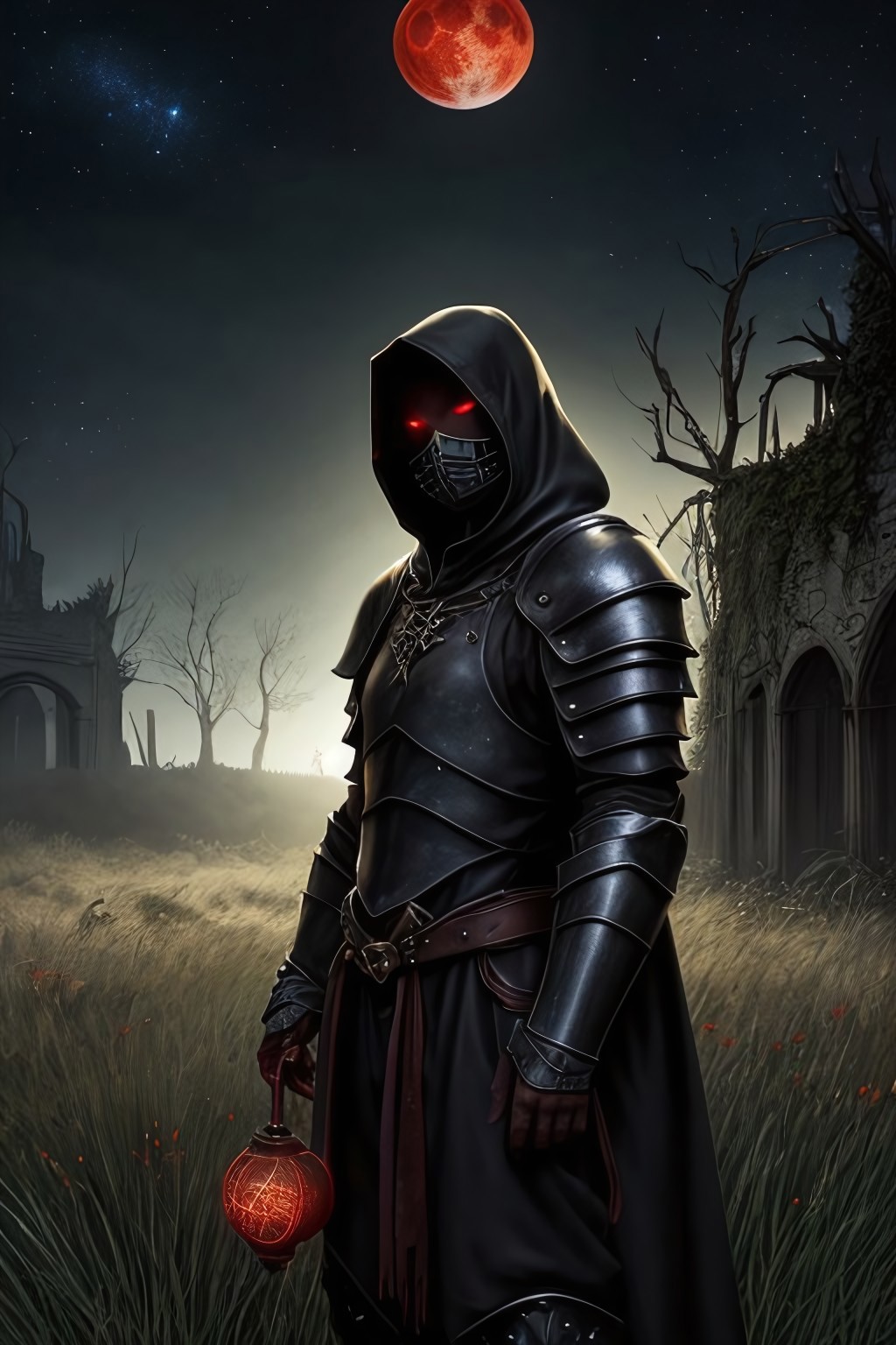 masterpiece, artistic, high quality, detailed, fantasy style, dark tone, dark shadows, 1 character, standing in a ruin, leather armor, hood up, red glowing eyes, face in shadow, big dark spread wings, magic, dark clothing, fantasy plants, night sky, big blood moon, many stars, bushes grass,
