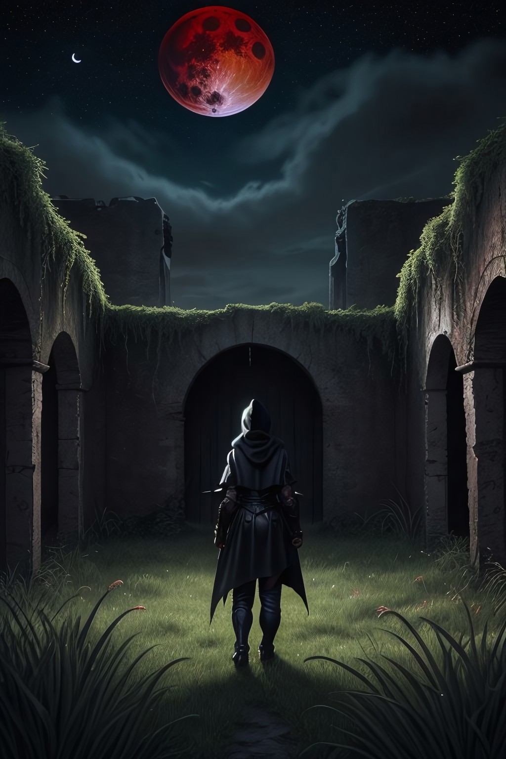 masterpiece, artistic, high quality, detailed, fantasy style, dark tone, dark shadows, 1 character, standing in a ruin, leather armor, view from behind, hood up, Dark wings, magic, dark clothing, motion pose, fantasy plants, night sky, big blood moon, many stars, bushes grass,