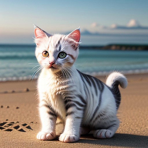 Capture a full hyper-realistic photograph of an adorable white kitten at a beach, cutest in civitai, chubby cat,