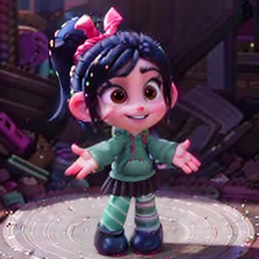 (best quality, masterpiece:1.2), 1girl, photon mapping, radiosity, physically-based rendering, best quality, highly detailed, solo focus, Vanellope, brown eyes, outdoor, city, street, night, ((short legs)), facing the viewer, standing, hands in the hoodie, smile, mint green hooded sweatshirt, black shoes, brown peanut butter cup skirt, green tights with white stripes, candy hair, red licorice ribbon, different posing, four fingers, simple solid background, solo, heart hands pose, image trim <lora:vaneV2:0.75>