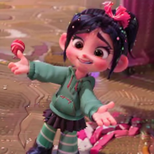 (best quality, masterpiece:1.2), 1girl, photon mapping, radiosity, physically-based rendering, best quality, highly detailed, solo focus, Vanellope, brown eyes, outdoor, city, street, night, ((short legs)), facing the viewer, standing, hands in the hoodie, smile, mint green hooded sweatshirt, black shoes, brown peanut butter cup skirt, green tights with white stripes, candy hair, red licorice ribbon, candyland, different posing, four fingers, different backgrounds, solo, mouth gestures, heart hands gesture <lora:vaneV2:0.75>