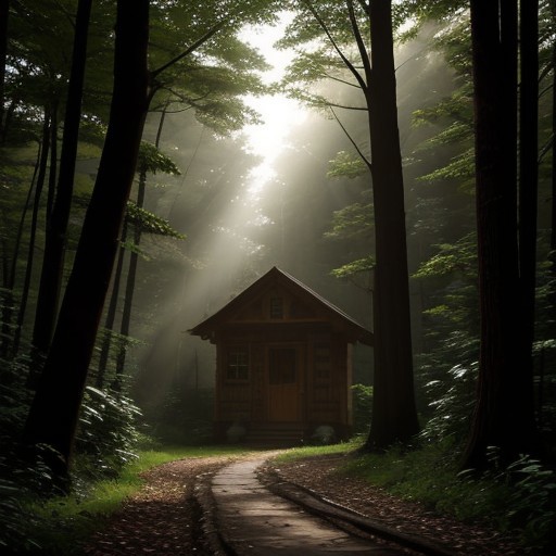 A rustic cabin nestled in the heart of a dense forest, surrounded by tall, ancient trees. The scene is set during sunset, with golden rays of sunlight filtering through the leaves, creating a warm and peaceful ambiance. A small path leads to the cabin's wooden door, and a gentle breeze rustles the leaves