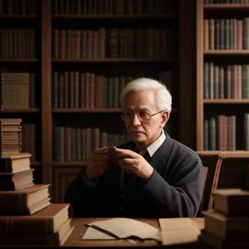 A wise old librarian in an ancient, grand library filled with towering bookshelves and dusty old tomes. The librarian is seated at a wooden desk, reading a large, leather-bound book. Soft, golden light from a nearby lamp illuminates the pages and the librarian's focused expression