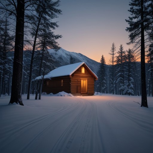 A serene winter landscape of a snow-covered mountain, with towering pine trees blanketed in snow. The sky is clear with the sun shining brightly, casting a warm golden hue on the snow. In the distance, a small wooden cabin with smoke rising from the chimney adds a cozy touch to the cold environment