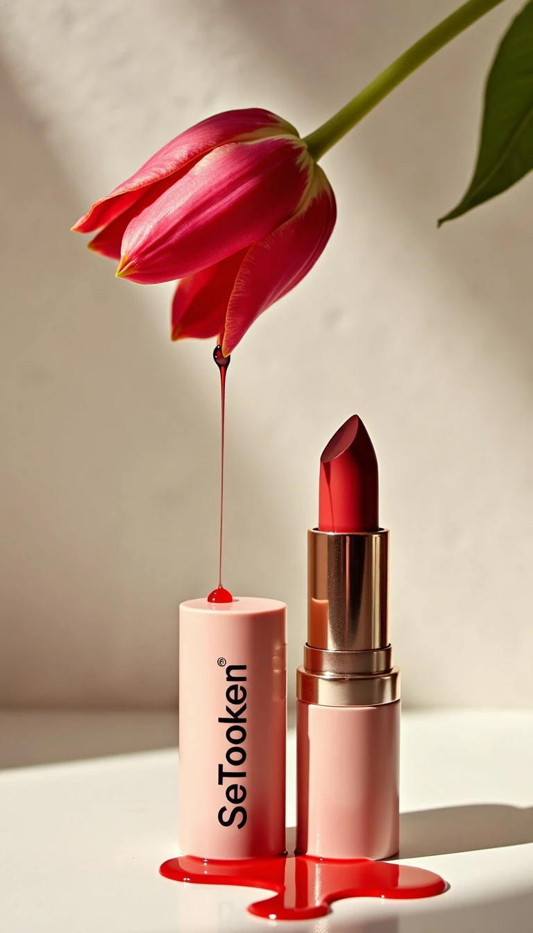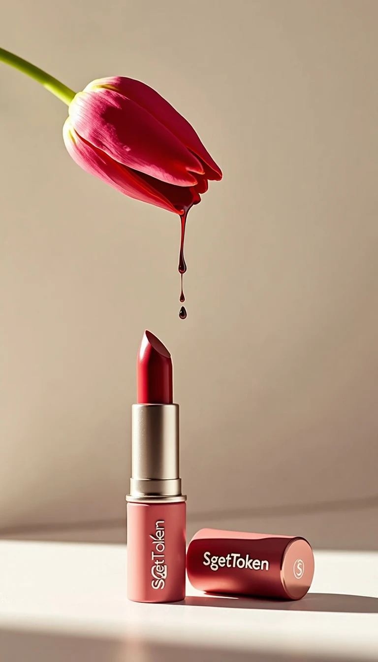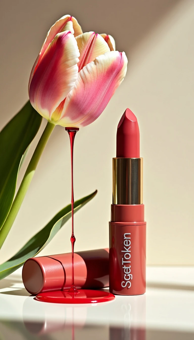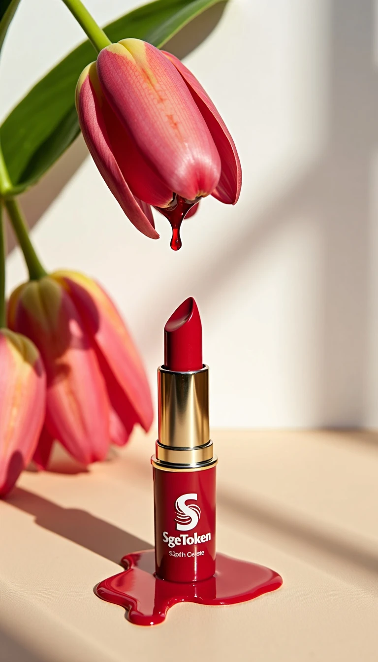 A lipstick with the brand name "SgetToken" on it, sitting next to an elegant tulip and dripping liquid onto its petals. The background is white, creating contrast between the lips of color from below and the neutral beige backdrop above them. It is a minimalist yet stylish shot that highlights both product and floral elements in high detail, in the style of an elegant yet minimalist shot