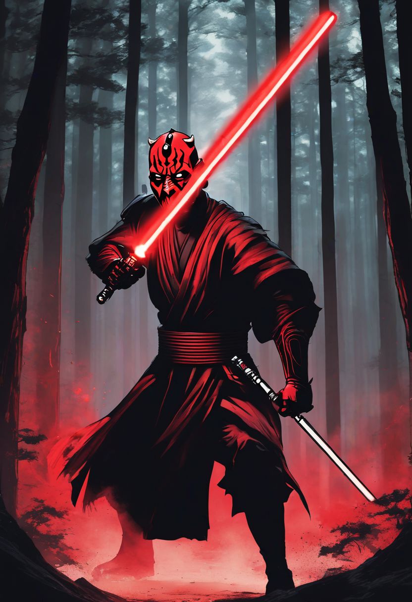 Anime style Darth Maul wielding a crimson light saber fighting an anime style stormtrooper wielding a red lightsaber, illustration art of a dark fantasy theme, the anime style Darth Maul in dynamic combat stance, elements of Kyubi chakra flickering around him, shadowed forest background cast in muted tones, foreground highlighted with red glow from the saber. The anime style Darth Maul is about to duel with an anime style stormtrooper high-quality, cinematic shot for a poster-worthy display, dramatic lighting, 16k resolution. Inspired by Japanese anime of the 1990s.