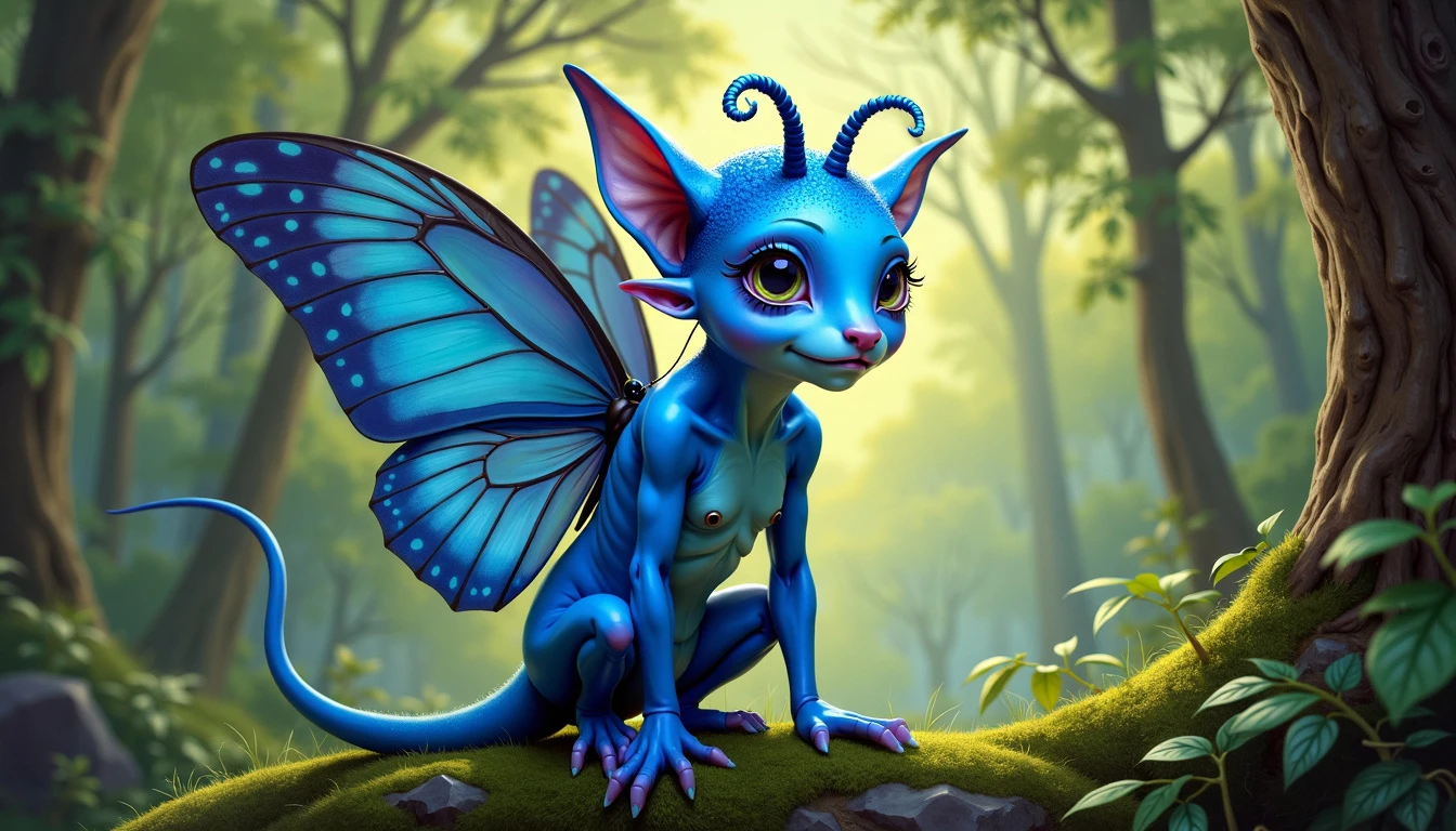 a blue skinned fay with filigran limbs and a blue gnome like face and several blue antennas on the head and the body of a butterfly with several wings, backround is a forest, realistic painting, creature design,