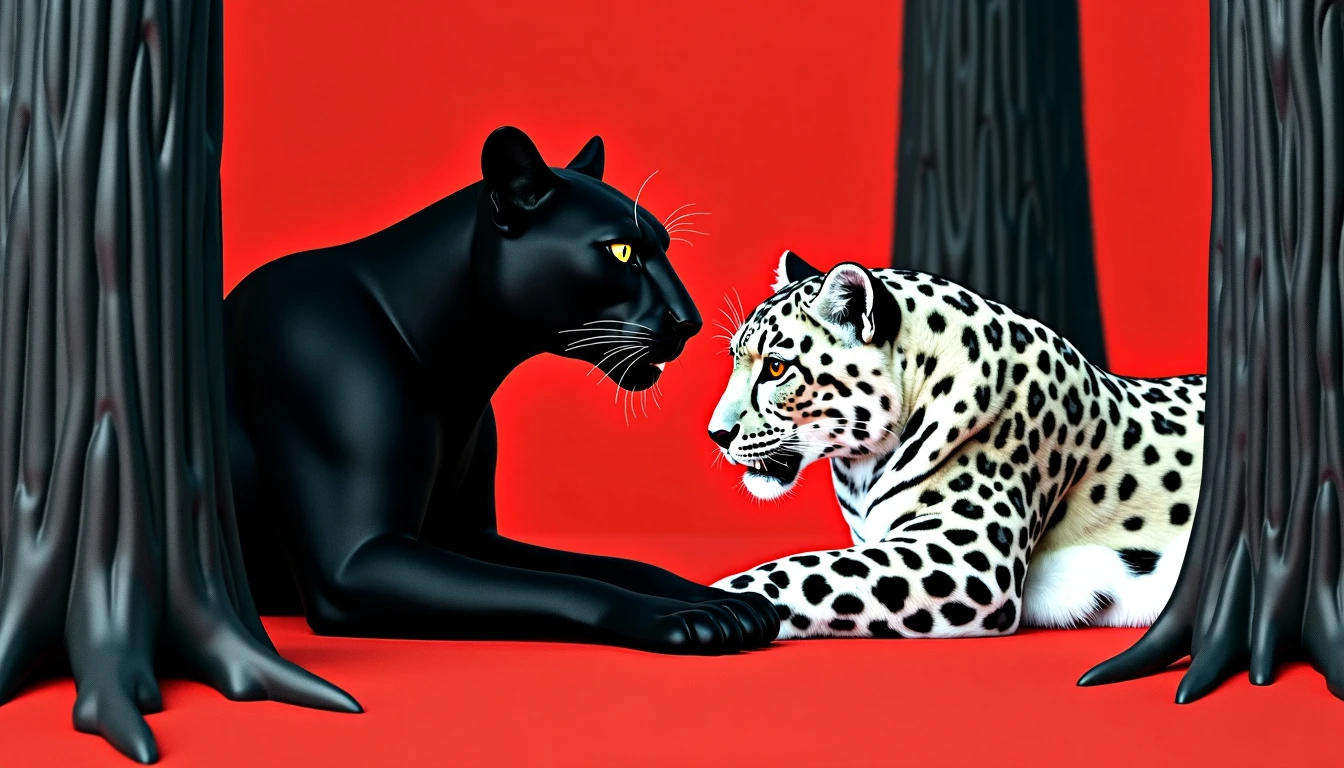 Surrealist Photography: A black panther and a snow leopard on a pure red background, with thick black tree trunks in the background